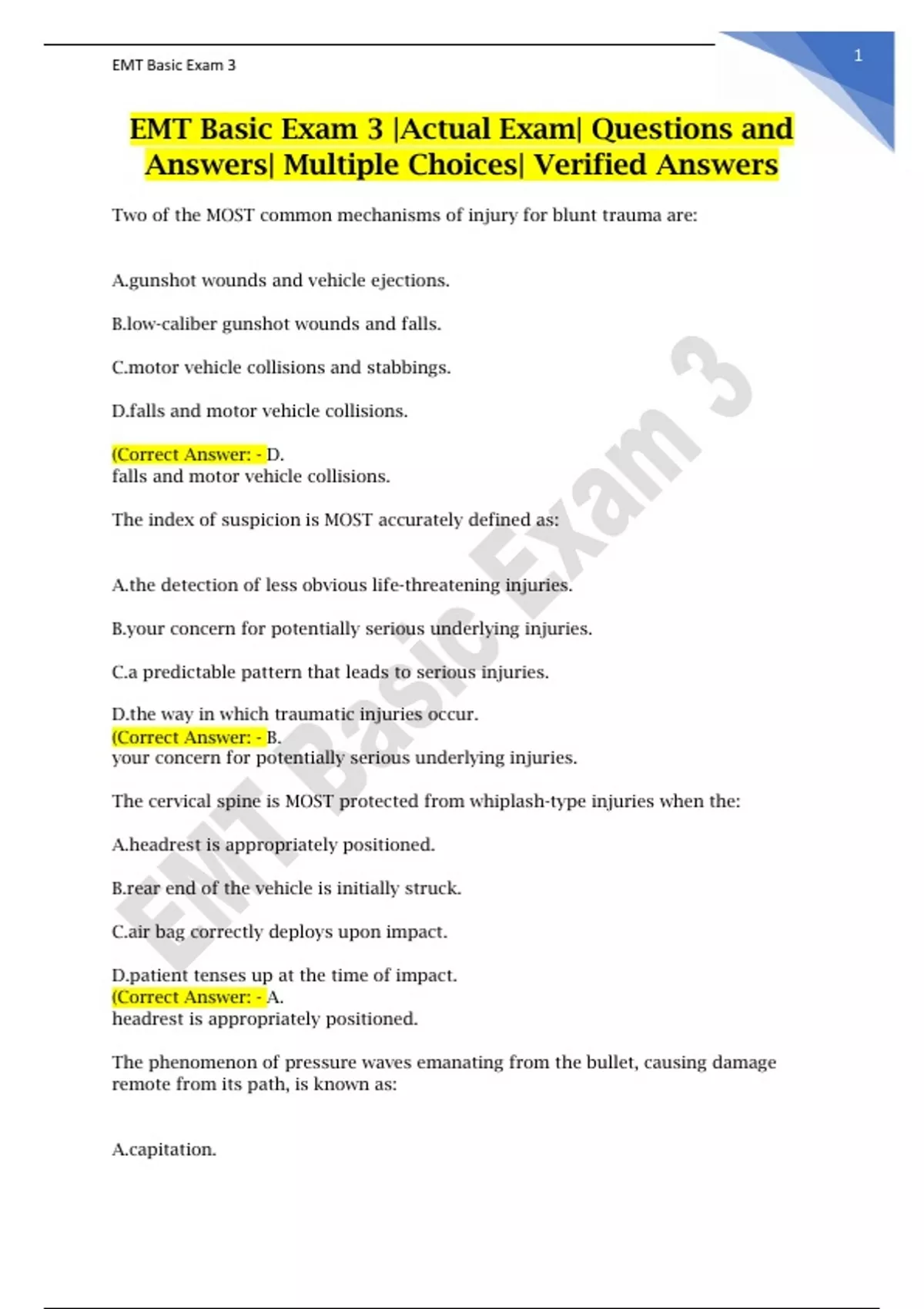 EMT Basic Exam 3 |Actual Exam| Questions and Answers| Multiple Choices| Verified Answers The MOST common and serious complication of a significant head injury is: A. cerebral edema. B. acute hypotension. C. a skull fracture. D. a hypoxic seizure. (Correct Answer: - A. cerebral edema. Moderate elevation in intracranial pressure with middle brain stem involvement is characterized by: A. increased blood pressure, bradycardia, reactive pupils, and rapid respirations. B. fixed and dilated pupils, decreased blood pressure, and irregular respirations. C. ataxic respirations, unequal pupils, no response to pain, and an irregular pulse. D. sluggishly reactive pupils, widened pulse pressure, bradycardia, and posturing. (Correct Answer: - D. sluggishly reactive pupils, widened pulse pressure, bradycardia, and posturing. Which of the following head injuries would cause the patient's condition to deteriorate MOST rapidly? A. epidural hematoma B. cerebral contusion C. cerebral concussion D. subdural hematoma (Correct Answer: - A. epidural hematoma Bleeding within the brain tissue itself is called a(n): A. subdural hematoma. B. intracranial hematoma. C. intracerebral hematoma. D. epidural hematoma. (Correct Answer: - C. intracerebral hematoma. Distraction injuries of the spine are MOST commonly the result of: A. compression. B. hangings. C. diving. D. falls. (Correct Answer: - B. hangings. Any unresponsive trauma patient should be assumed to have: A. a history of diabetes mellitus. B. a severe intracranial hemorrhage. C. an accompanying spinal injury. D. internal bleeding in the abdomen. (Correct Answer: - C. an accompanying spinal injury. When opening the airway of a patient with a suspected spinal injury, you should use the: A. head tilt-neck lift maneuver. B. tongue-jaw lift maneuver. C. jaw-thrust maneuver. D. head tilt-chin lift maneuver. (Correct Answer: - C. jaw-thrust maneuver. During your primary assessment of a semiconscious 30-year-old female with closed head trauma, you note that she has slow, shallow breathing and a slow, bounding pulse. As your partner maintains manual in-line stabilization of her head, you should: A. immediately place her on a long backboard and prepare for rapid transport. B. instruct him to assist her ventilations while you perform a rapid assessment. C. apply 100% oxygen via a nonrebreathing mask and obtain baseline vital signs. D. p (Correct Answer: - B. instruct him to assist her ventilations while you perform a rapid assessment. You should be MOST suspicious that a patient has experienced a significant head injury if his or her pulse is: A. slow. B. weak. C. irregular. D. rapid. (Correct Answer: - A. slow. The MOST reliable sign of a head injury is: A. an abnormally low blood pressure. B. decreased sensation in the extremities. C. a pulse that is rapid and thready. D. a decreased level of consciousness. (Correct Answer: - D. a decreased level of consciousness.