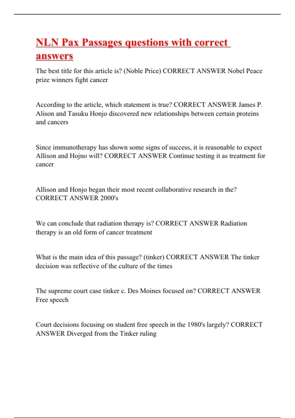 The best title for this article is? (Noble Price) CORRECT ANSWER Nobel Peace prize winners fight cancer According to the article, which statement is true? CORRECT ANSWER James P. Alison and Tasuku Honjo discovered new relationships between certain proteins and cancers Since immunotherapy has shown some signs of success, it is reasonable to expect Allison and Hojno will? CORRECT ANSWER Continue testing it as treatment for cancer Allison and Honjo began their most recent collaborative research in the? CORRECT ANSWER 2000's We can conclude that radiation therapy is? CORRECT ANSWER Radiation therapy is an old form of cancer treatment What is the main idea of this passage? (tinker) CORRECT ANSWER The tinker decision was reflective of the culture of the times The supreme court case tinker c. Des Moines focused on? CORRECT ANSWER Free speech Court decisions focusing on student free speech in the 1980's largely? CORRECT ANSWER Diverged from the Tinker ruling