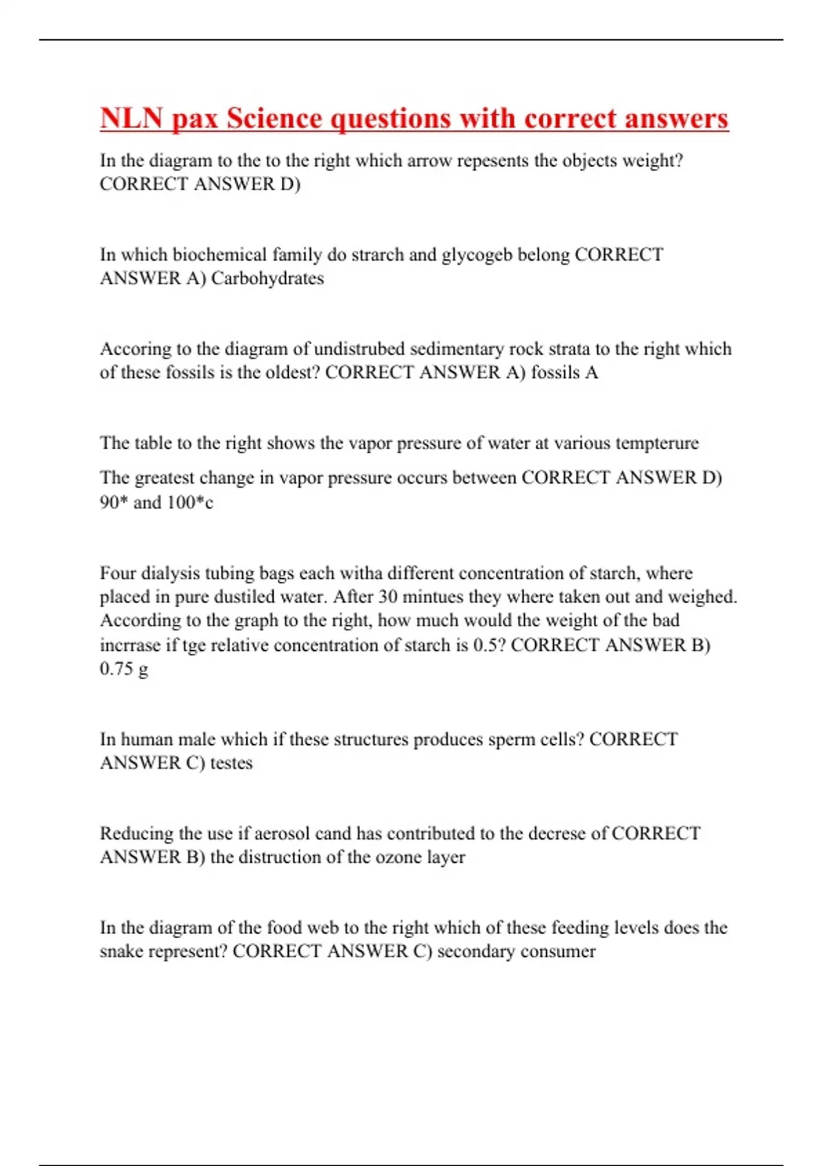In the diagram to the to the right which arrow repesents the objects weight? CORRECT ANSWER D) In which biochemical family do strarch and glycogeb belong CORRECT ANSWER A) Carbohydrates Accoring to the diagram of undistrubed sedimentary rock strata to the right which of these fossils is the oldest? CORRECT ANSWER A) fossils A The table to the right shows the vapor pressure of water at various tempterure The greatest change in vapor pressure occurs between CORRECT ANSWER D) 90* and 100*c Four dialysis tubing bags each witha different concentration of starch, where placed in pure dustiled water. After 30 mintues they where taken out and weighed. According to the graph to the right, how much would the weight of the bad incrrase if tge relative concentration of starch is 0.5? CORRECT ANSWER B) 0.75 g In human male which if these structures produces sperm cells? CORRECT ANSWER C) testes Reducing the use if aerosol cand has contributed to the decrese of CORRECT ANSWER B) the distruction of the ozone layer