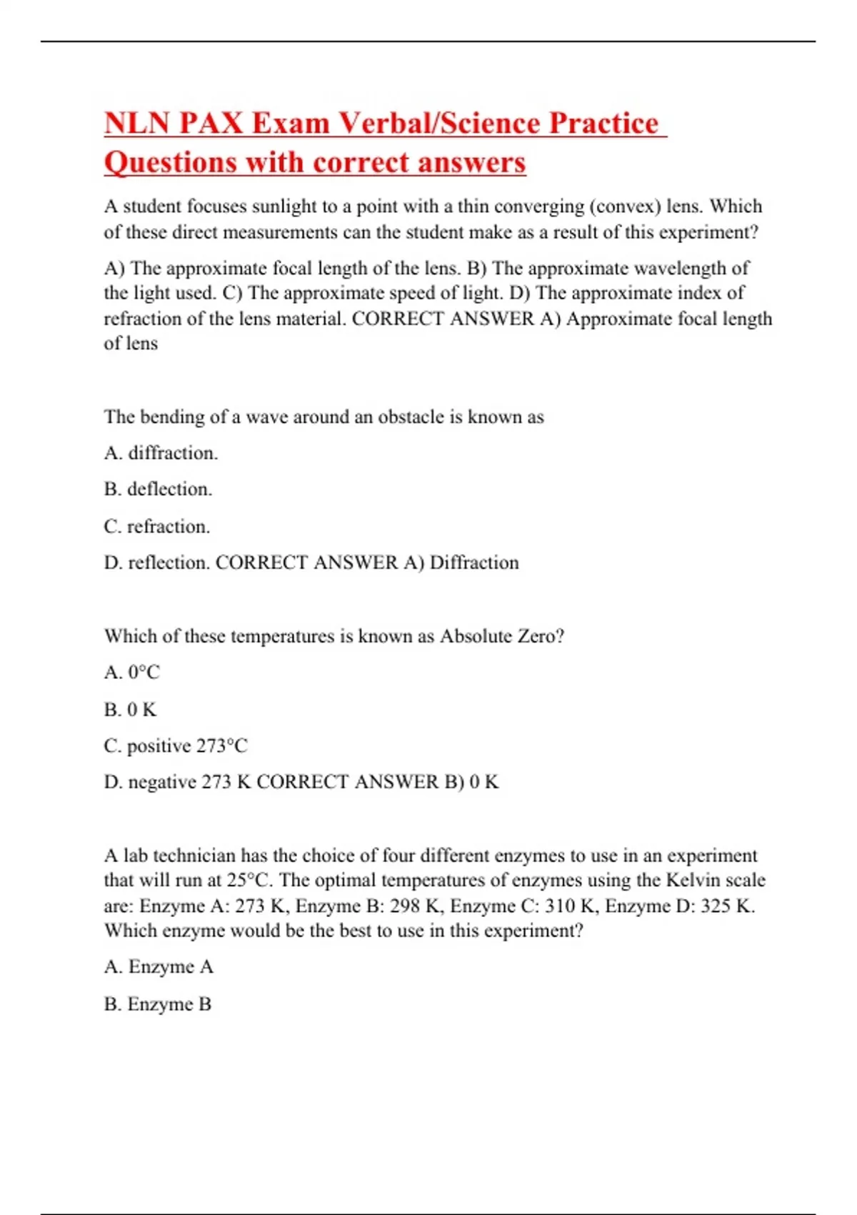 A student focuses sunlight to a point with a thin converging (convex) lens. Which of these direct measurements can the student make as a result of this experiment? A) The approximate focal length of the lens. B) The approximate wavelength of the light used. C) The approximate speed of light. D) The approximate index of refraction of the lens material. CORRECT ANSWER A) Approximate focal length of lens The bending of a wave around an obstacle is known as A. diffraction. B. deflection. C. refraction. D. reflection. CORRECT ANSWER A) Diffraction Which of these temperatures is known as Absolute Zero? A. 0°C B. 0 K C. positive 273°C D. negative 273 K CORRECT ANSWER B) 0 K A lab technician has the choice of four different enzymes to use in an experiment that will run at 25°C. The optimal temperatures of enzymes using the Kelvin scale are: Enzyme A: 273 K, Enzyme B: 298 K, Enzyme C: 310 K, Enzyme D: 325 K. Which enzyme would be the best to use in this experiment? A. Enzyme A B. Enzyme B