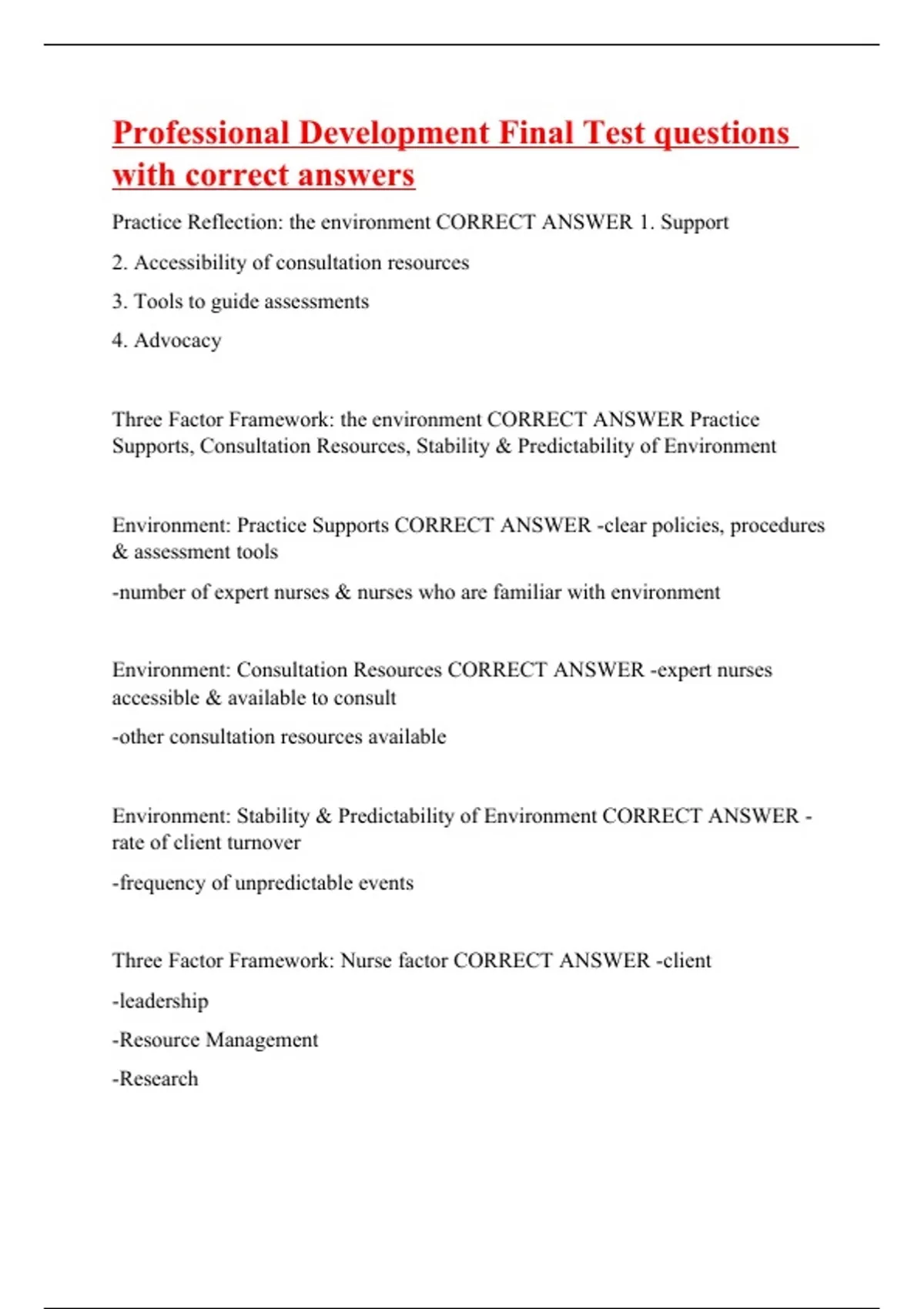 Practice Reflection: the environment CORRECT ANSWER 1. Support 2. Accessibility of consultation resources 3. Tools to guide assessments 4. Advocacy Three Factor Framework: the environment CORRECT ANSWER Practice Supports, Consultation Resources, Stability & Predictability of Environment Environment: Practice Supports CORRECT ANSWER -clear policies, procedures & assessment tools -number of expert nurses & nurses who are familiar with environment Environment: Consultation Resources CORRECT ANSWER -expert nurses accessible & available to consult -other consultation resources available Environment: Stability & Predictability of Environment CORRECT ANSWER -rate of client turnover -frequency of unpredictable events Three Factor Framework: Nurse factor CORRECT ANSWER -client -leadership -Resource Management -Research