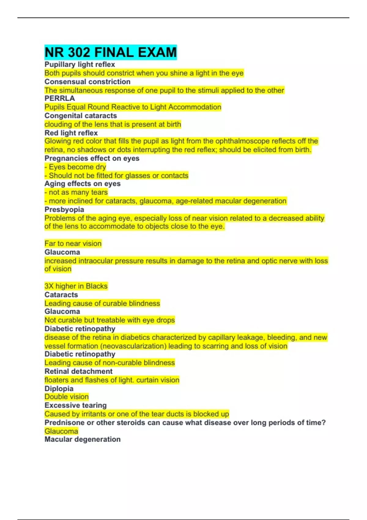 NR 302 FINAL EXAM Pupillary light reflex Both pupils should constrict when you shine a light in the eye Consensual constriction The simultaneous response of one pupil to the stimuli applied to the other PERRLA Pupils Equal Round Reactive to Light Accommodation Congenital cataracts clouding of the lens that is present at birth Red light reflex Glowing red color that fills the pupil as light from the ophthalmoscope reflects off the retina, no shadows or dots interrupting the red reflex; should be elicited from birth. Pregnancies effect on eyes - Eyes become dry - Should not be fitted for glasses or contacts Aging effects on eyes - not as many tears - more inclined for cataracts, glaucoma, age-related macular degeneration Presbyopia Problems of the aging eye, especially loss of near vision related to a decreased ability of the lens to accommodate to objects close to the eye. Far to near vision Glaucoma increased intraocular pressure results in damage to the retina and optic nerve with loss of vision 3X higher in Blacks Cataracts Leading cause of curable blindness Glaucoma Not curable but treatable with eye drops Diabetic retinopathy disease of the retina in diabetics characterized by capillary leakage, bleeding, and new vessel formation (neovascularization) leading to scarring and loss of vision Diabetic retinopathy Leading cause of non-curable blindness Retinal detachment floaters and flashes of light. curtain vision Diplopia Double vision Excessive tearing Caused by irritants or one of the tear ducts is blocked up Prednisone or other steroids can cause what disease over long periods of time? Glaucoma Macular degeneration loss of central vision not curable; could be genetic Snellen eye chart Tool for assessing far vision Person stands 20 feet away and uses one eye at a time How to properly write down the snellen eye chart RIght 20/30 -1 (missed one, with glasses) Corneal Light Reflex (Hirschberg Test) reflection of the light on the corneas, should be in the exactly same spot on each eye assymetry indicates deviation in alignment from eye muscle weakness or paralysis Nystagmus involuntary, jerking movements of the eyes ; quivers Conjunctivitis inflammation of the conjunctiva (pink eye) Myopia nearsightedness; lack of foresight Hyperopia farsightedness; difficulty seeing close objects when light rays are focused on a point behind the retina Strabismus crossed eyes or squint Ptosis drooping of the eyelid; usually caused by paralysis Ex. Sylvester stalone Blepharitis inflammation of eyelid, causing redness, crusting, and swelling along lid margins Chalazion a nodule or cyst, usually on the upper eyelid, caused by obstruction in a sebaceous gland Hordeolum Stye; staph infection of the eye Iritis inflammation of the iris; deep dull red halo around the iris and cornea warrants immediate referral Allergic Conjunctivitis inflammation of the conjunctiva caused by allergens in the air Primary Angle-Closure Glaucoma acute narrow angle glaucoma shows circumcorneal redness around the iris, with a dilated pupil Papilledema (choked disc)