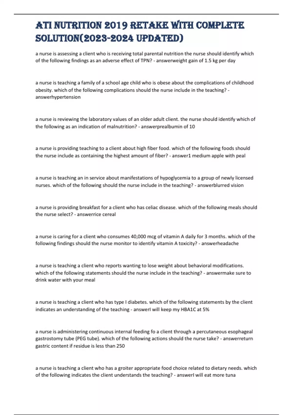 ATI Nutrition 2019 Retake With Complete Solution( Updated)