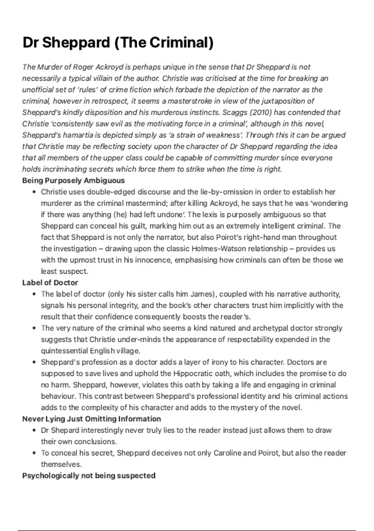 Summary A* ENGLISH LITERATURE - MURDER OF ROGER ACKROYD NOTES Dr Sheppard (The Criminal)