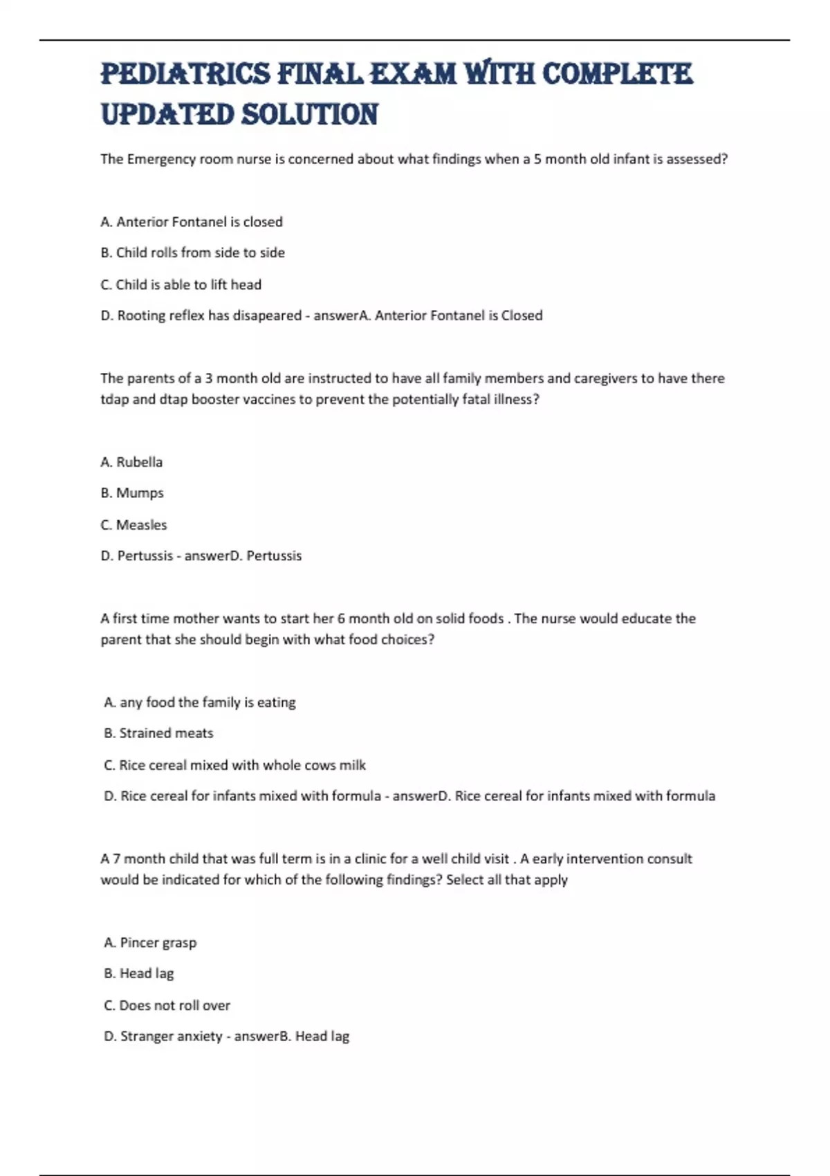 Pediatrics FINAL EXAM With Complete Updated Solution