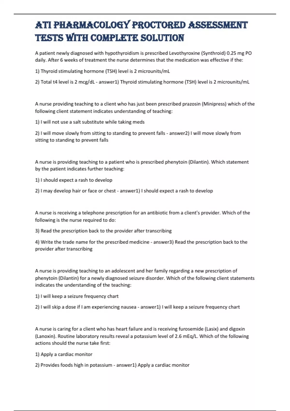 ATI Pharmacology Proctored Assessment Tests With Complete S olution A patient newly diagnosed with hypothyroidism is prescribed Levothyroxine (Synthroid) 0.25 mg PO daily. After 6 weeks of treatment the nurse determines that the medication was effective if the: 1) Thyroid stimulating hormone (TSH) level is 2 microunits/mL 2) Total t4 level is 2 mcg/dL - answer1) Thyroid stimulating hormone (TSH) level is 2 microunits/mL A nurse providing teaching to a client who has just been prescribed prazosin (Minipress) which of the following client statement indicates understanding o f teaching: 1) I will not use a salt substitute while taking meds 2) I will move slowly from sitting to standing to prevent falls - answer2) I will move slowly from sitting to standing to prevent falls A nurse is providing teaching to a patient who is pre scribed phenytoin (Dilantin). Which statement by the patient indicates further teaching: 1) I should expect a rash to develop 2) I may develop hair or face or chest - answer1) I should expect a rash to develop A nurse is receiving a telephone prescription for an antibiotic from a client's provider. Which of the following is the nurse required to do: 3) Read the prescription back to the provider after transcribing 4) Write the trade name for the prescribed medicine - answer3) Read the prescription back to t he provider after transcribing A nurse is providing teaching to an adolescent and her family regarding a new prescription of phenytoin (Dilantin) for a newly diagnosed seizure disorder. Which of the following client statements indicates the understanding of the teaching: 1) I will keep a seizure frequency chart 2) I will skip a dose if I am experiencing nausea - answer1) I will keep a seizure frequency chart A nurse is caring for a client who has heart failure and is receiving furosemide (Lasix) and digox in (Lanoxin). Routine laboratory results reveal a potassium level of 2.6 mEq/L. Which of the following actions should the nurse take first: 1) Apply a cardiac monitor 2) Provides foods high in potassium - answer1) Apply a cardiac monitor ATI Pharmacology Proctored Assessment Tests With Complete S olution A nurse administe rs ceftazidime (Fortaz) to a client who has a severe penicillin allergy. Which of the following client findings requires an incident report: 1) The client is also taking linsinophrel (Prinivil) 2) The client reports shortness of breath - answer2) The clien t reports shortness of breath A nurse is providing teaching to a female client who has been newly diagnosed with a seizure disorder and has begun phenytoin (Dilantin). The nurse should tell the client that phenytoin can decrease the effectiveness of which of the following: 1) Ethunyl estradiol/desogestrel (Cyclessa) 2) Fluroxetine (Prozac) - answer1) Ethunyl estradiol/desogestrel (Cyclessa) A nurse providing teaching to a client who is diagnosed with migrane headaches. The client is prescribed ergotamine (Ergostat) sublingual (SL). Which of the following should the nurse include in her instructions: 1) Take 1SL tablet three times a day before meals 2) Take 1SL tablet at onset of migrane - answer2) Take 1SL tablet at onset of migrane A nurse is reviewing a client's daily laboratory findings before administering 0.125 mg of digoxin (Lanoxin). The client's serum digoxin level is 0.7 mg/mL. Which of the following actions should the nurse take: 1) Give the medication 2) Request a dose increase - answer1) Give the medication A nurse is planning to provide medication education for a client who will begin a course of therapy with metronidazole (Flagy l). Which of the following should the nurse instruct the client to avoid during the course of therapy: 3) Coffee 4) Beer - answer4) Beer A nurse is teaching a client who has heart failure about a new prescription for captopril (Capoten). Which of the foll owing statements by the client indicates a need for further teaching: 3) I will take the medication 1 hr before my meals ATI Pharmacology Proctored Assessment Tests With Complete S olution 4) I will use a salt substitute with my meals - answer4) I will use a salt substitute with my meals A client is experiencing acute ang le closure glaucoma and IV mannitol (Osmitrol) 25% is prescribed. Which of the following client findings should the nurse recognize as being the best indication that the medication is achieving it's therapeutic effect: 3) Decrease in intraocular pressure 4) Lung fluids clear to auscultation - answer3) Decrease in intraocular pressure A nurse is educating a client who has a new prescription for simvastatin (Zacor). Which of the following instructions should the nurse include in the teaching plan: (Select al l that apply): 1) Report muscle pain to provider 2) Do not take the medication with grapefruit juice 3) Take the medication in the early morning 4) Minimize intake of alcoholic beverages 5) Expect therapy with this medication to be life long - answer1) Rep ort muscle pain to provider 2) Do not take the medication with grapefruit juice 4) Minimize intake of alcoholic beverages 5) Expect therapy with this medication to be life long A client taking IV heparin and oral warfarin (coumadin) for deep thrombosis. The client aPTT is 4x the normal value and his INR is 2. Which of the following actions should the nurse plan to take: 1) Decrease the heparin 2) Increase the warfarin - answer1) Decrease the heparin The nurse is caring for a client who is in labor. The client is receiving oxytocin (pitocin) by continuous IV infusion, piggy backed into a maintenance IV solution. The external FHR monitor indicates late decelerations. Which of the f ollowing actions should the nurse take first: 1) Turn the client to side lying position 2) Discontinue the client's IV meds - answer2) Discontinue the client's IV meds A nurse is providing teaching to a client taking bupropion (Zyban) as an aid to quit sm oking. For which of the following side effects should the nurse assess the client: