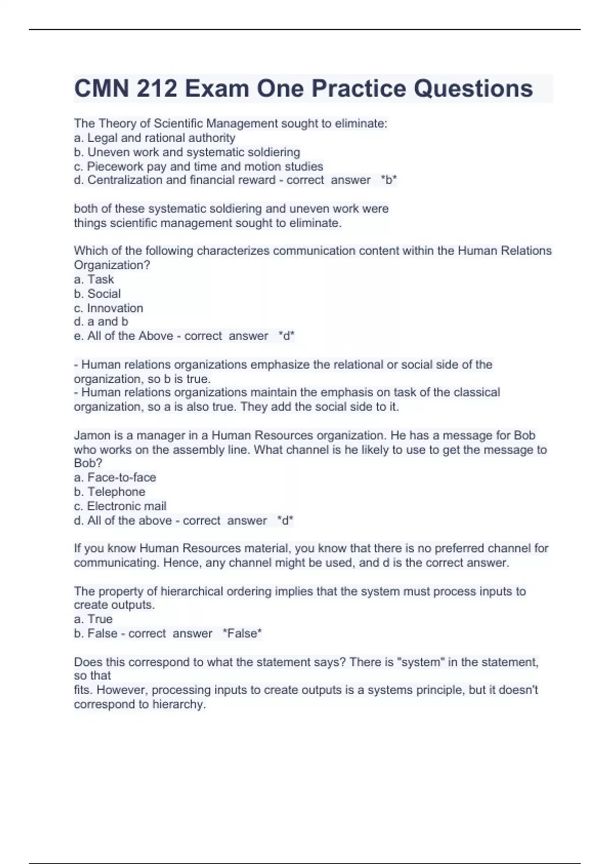 CMN 212 Exam One Practice Questions and answers already pass 2023/2024The Theory of Scientific Management sought to eliminate: a. Legal and rational authority b. Uneven work and systematic soldiering c. Piecework pay and time and motion studies d. Centralization and financial reward - correct answer *b* both of these systematic soldiering and uneven work were things scientific management sought to eliminate. Which of the following characterizes communication content within the Human Relations Organization? a. Task b. Social c. Innovation d. a and b