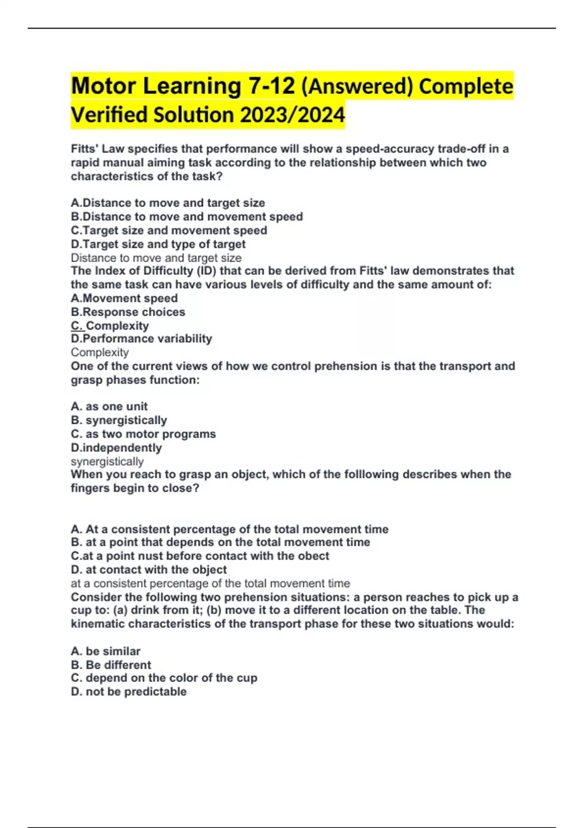 Motor Learning 7-12 (Answered) Complete Verified Solution 2023/2024 Fitts' Law specifies that performance will show a speed-accuracy trade-off in a rapid manual aiming task according to the relationship between which two characteristics of the task? A.Distance to move and target size B.Distance to move and movement speed C.Target size and movement speed D.Target size and type of target Distance to move and target size The Index of Difficulty (ID) that can be derived from Fitts' law demonstrates that the same task can have various levels of difficulty and the same amount of: A.Movement speed B.Response choices C. Complexity D.Performance variability Complexity One of the current views of how we control prehension is that the transport and grasp phases function: A. as one unit B. synergistically C. as two motor programs D.independently synergistically When you reach to grasp an object, which of the folllowing describes when the fingers begin to close? A. At a consistent percentage of the total movement time B. at a point that depends on the total movement time C.at a point nust before contact with the obect D. at contact with the object at a consistent percentage of the total movement time Consider the following two prehension situations: a person reaches to pick up a cup to: (a) drink from it; (b) move it to a different location on the table. The kinematic characteristics of the transport phase for these two situations would: A. be similar B. Be different C. depend on the color of the cup D. not be predictable