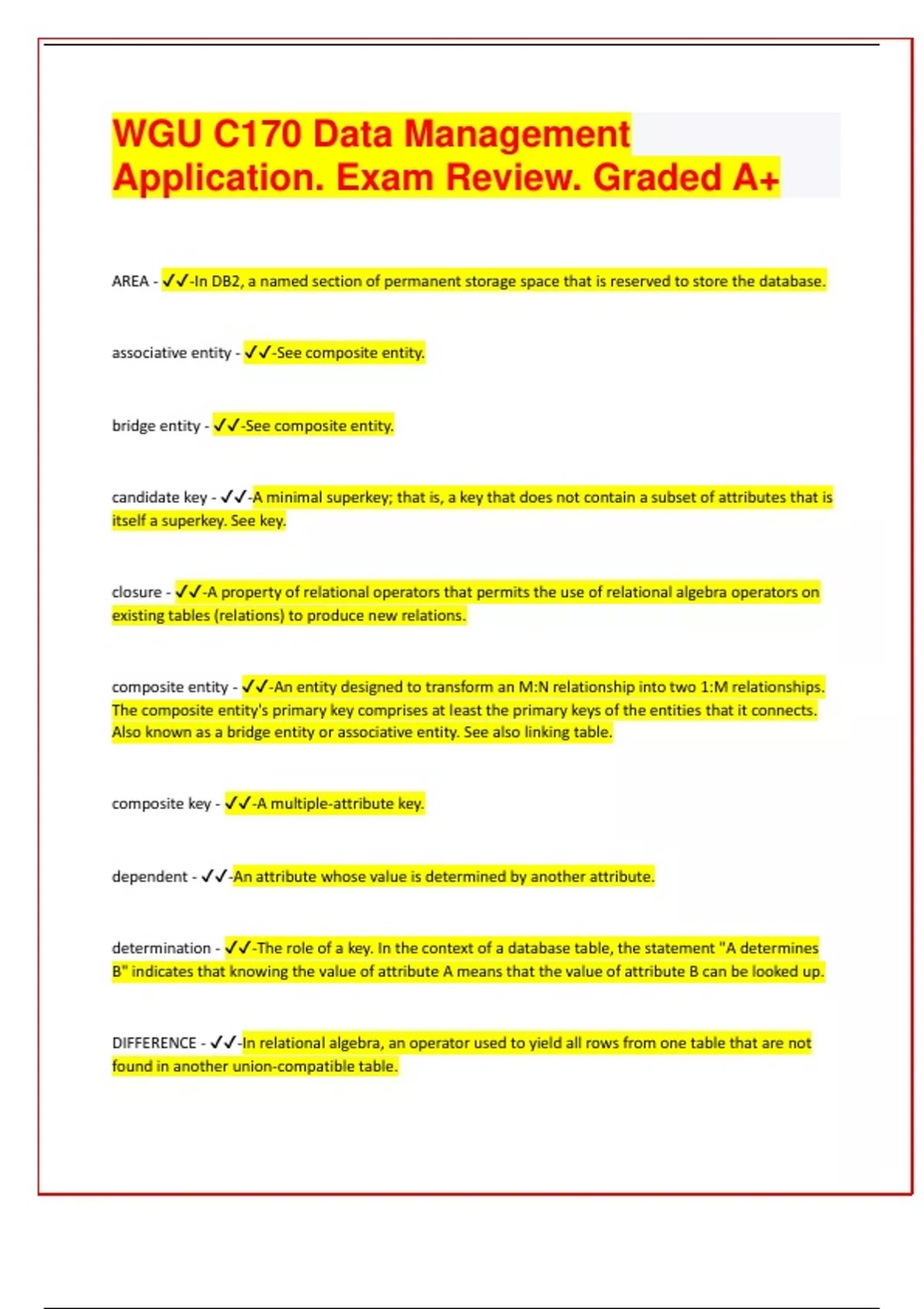 WGU C170 Data Management Application. Exam Review. Graded A+ AREA - -In DB2, a named section of permanent storage space that is reserved to store the database. associative entity - -See composite entity. bridge entity - -See composite entity. candidate key - -A minimal superkey; that is, a key that does not contain a subset of attributes that is itself a superkey. See key. closure - -A property of relational operators that permits the use of relational algebra operators on existing tables (relations) to produce new relations. composite entity - -An entity designed to transform an M:N relationship into two 1:M relationships. The composite entity's primary key comprises at least the primary keys of the entities that it connects. Also known as a bridge entity or associative entity. See also linking table. composite key - -A multiple-attribute key. dependent - -An attribute whose value is determined by another attribute. determination - -The role of a key. In the context of a database table, the statement "A determines B" indicates that knowing the value of attribute A means that the value of attribute B can be looked up. DIFFERENCE - -In relational algebra, an operator used to yield all rows from one table that are not found in another union-compatible table