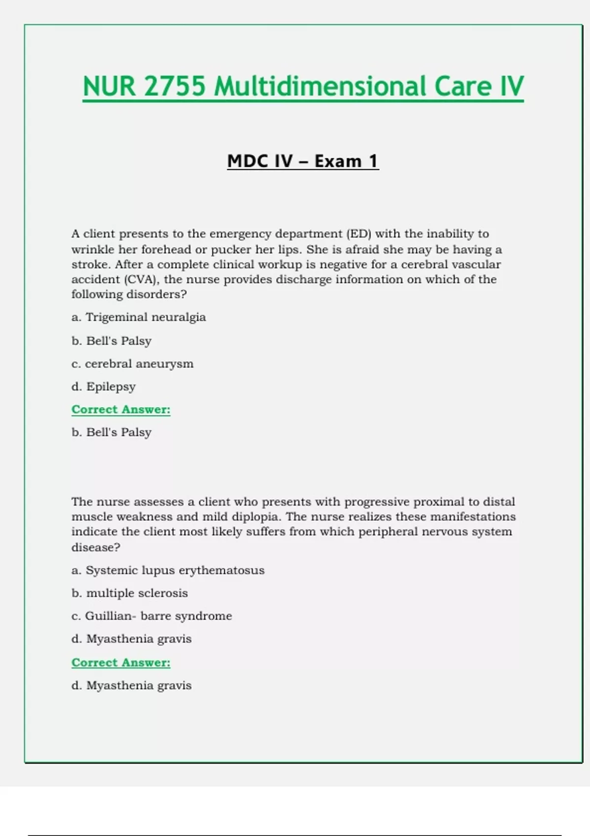 Exam 1: NUR2755 / NUR 2755 (Latest 2024 / 2025 Updates STUDY BUNDLE WITH COMPLETE SOLUTIONS) Multidimensional Care IV / MDC 4 | Questions and Verified Answers | 100% Correct | Graded A - Rasmussen