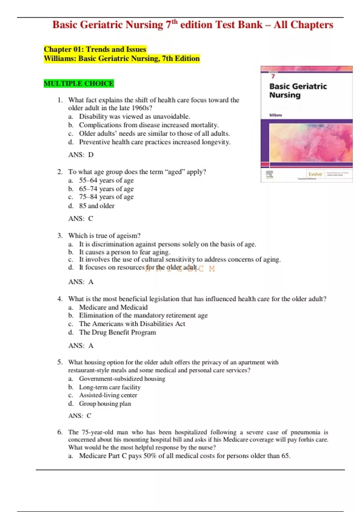 Basic Geriatric Nursing 7th Edition Williams Test Bank