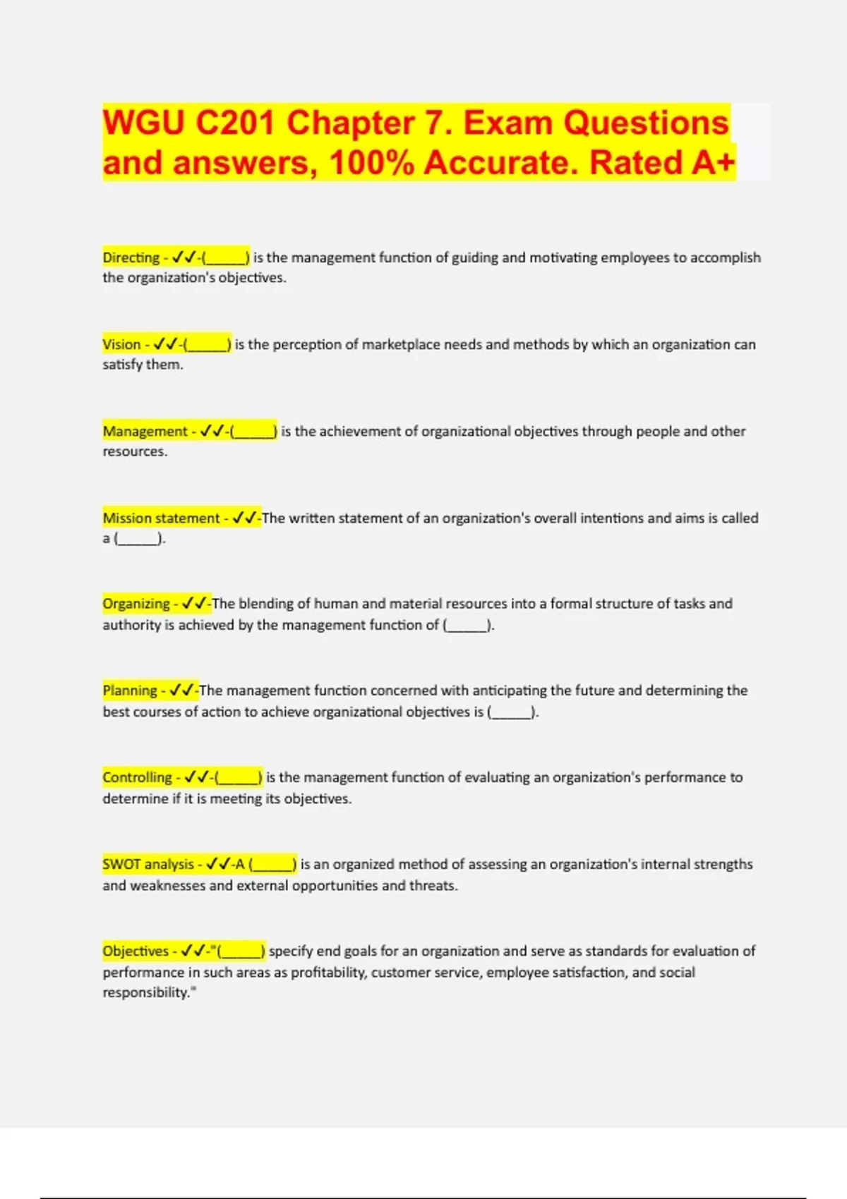 WGU C201 Chapter 7. Exam Questions and answers, 100% Accurate. Rated A+ Directing - -(_____) is the management function of guiding and motivating employees to accomplish the organization's objectives. Vision - -(_____) is the perception of marketplace needs and methods by which an organization can satisfy them. Management - -(_____) is the achievement of organizational objectives through people and other resources. Mission statement - -The written statement of an organization's overall intentions and aims is called a (_____). Organizing - -The blending of human and material resources into a formal structure of tasks and authority is achieved by the management function of (_____). Planning - -The management function concerned with anticipating the future and determining the best courses of action to achieve organizational objectives is (_____). Controlling - -(_____) is the management function of evaluating an organization's performance to determine if it is meeting its objectives. SWOT analysis - -A (_____) is an organized method of assessing an organization's internal strengths and weaknesses and external opportunities and threats. Objectives - -"(_____) specify end goals for an organization and serve as standards for evaluation of performance in such areas as profitability, customer service, employee satisfaction, and social responsibility." Contingency planning - -"When organizations try to anticipate and meet emergencies, enabling them to resume operations as quickly and smoothly as possible, th