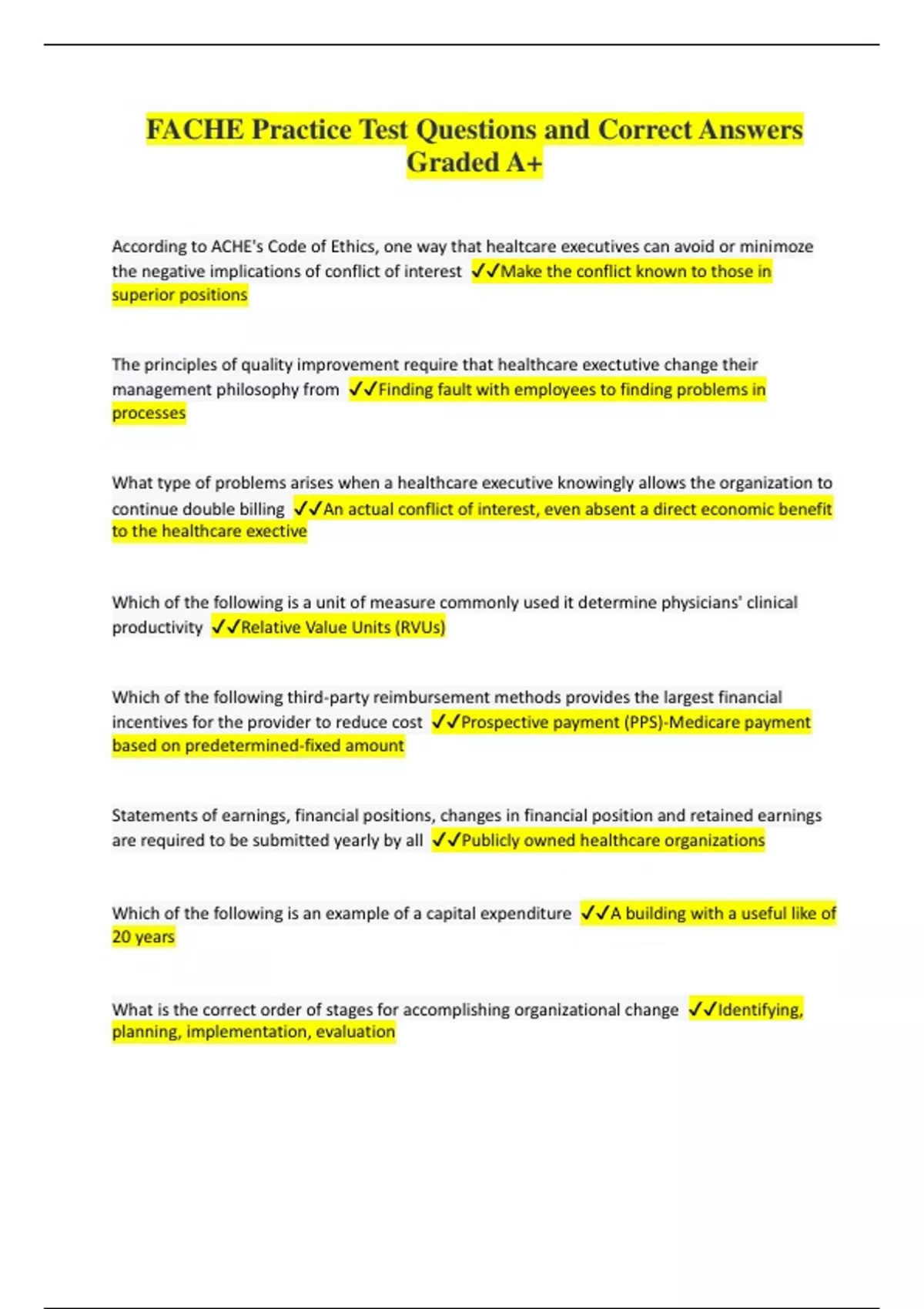 FACHE Practice Test Questions and Correct Answers Graded A+ According to ACHE's Code of Ethics, one way that healtcare executives can avoid or minimoze the negative implications of conflict of interest Make the conflict known to those in superior positions The principles of quality improvement require that healthcare exectutive change their management philosophy from Finding fault with employees to finding problems in processes What type of problems arises when a healthcare executive knowingly allows the organization to continue double billing An actual conflict of interest, even absent a direct economic benefit to the healthcare exective Which of the following is a unit of measure commonly used it determine physicians' clinical productivity Relative Value Units (RVUs) Which of the following third-party reimbursement methods provides the largest financial incentives for the provider to reduce cost Prospective payment (PPS)-Medicare payment based on predetermined-fixed amount Statements of earnings, financial positions, changes in financial position and retained earnings are required to be submitted yearly by all Publicly owned healthcare organizations Which of the following is an example of a capital expenditure A building with a useful like of 20 years What is the correct order of stages for accomplishing organizational change Identifying, planning, implementation, evaluatio