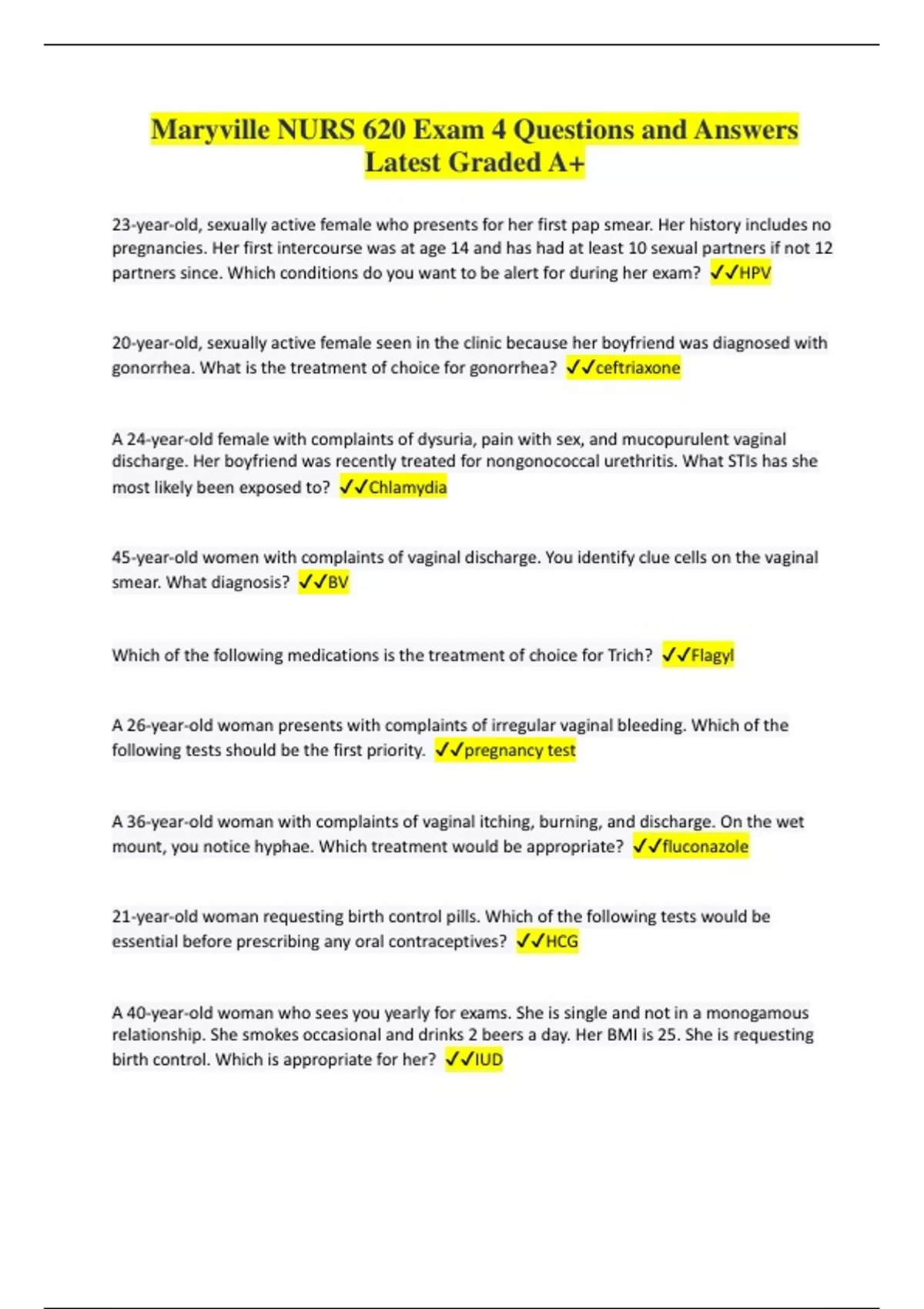 Maryville NURS 620 Exam 4 Questions and Answers Latest Graded A+ 23-year-old, sexually active female who presents for her first pap smear. Her history includes no pregnancies. Her first intercourse was at age 14 and has had at least 10 sexual partners if not 12 partners since. Which conditions do you want to be alert for during her exam? HPV 20-year-old, sexually active female seen in the clinic because her boyfriend was diagnosed with gonorrhea. What is the treatment of choice for gonorrhea? ceftriaxone A 24-year-old female with complaints of dysuria, pain with sex, and mucopurulent vaginal discharge. Her boyfriend was recently treated for nongonococcal urethritis. What STIs has she most likely been exposed to? Chlamydia 45-year-old women with complaints of vaginal discharge. You identify clue cells on the vaginal smear. What diagnosis? BV Which of the following medications is the treatment of choice for Trich? Flagyl A 26-year-old woman presents with complaints of irregular vaginal bleeding. Which of the following tests should be the first priority. pregnancy test A 36-year-old woman with complaints of vaginal itching, burning, and discharge. On the wet mount, you notice hyphae. Which treatment would be appropriate? fluconazole 21-year-old woman requesting birth control pills. Which of the following tests would be essential before prescribing any oral contraceptives? HCG A 40-year-old woman who sees you yearly for exams. She is single and not in a monogamous relationship. She smokes occasional and drinks 2 beers a day. Her BMI is 25. She is requesting birth control. Which is appropriate for her? IUD