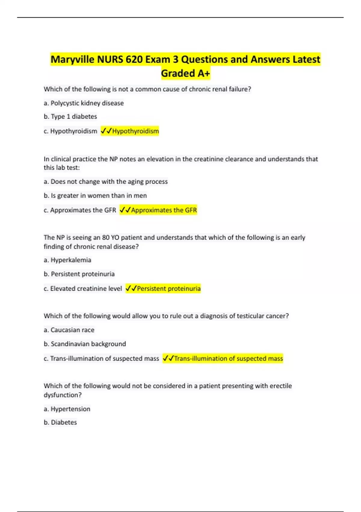 Maryville NURS 620 Exam 3 Questions and Answers Latest Graded A+ Which of the following is not a common cause of chronic renal failure? a. Polycystic kidney disease b. Type 1 diabetes c. Hypothyroidism Hypothyroidism In clinical practice the NP notes an elevation in the creatinine clearance and understands that this lab test: a. Does not change with the aging process b. Is greater in women than in men c. Approximates the GFR Approximates the GFR The NP is seeing an 80 YO patient and understands that which of the following is an early finding of chronic renal disease? a. Hyperkalemia b. Persistent proteinuria c. Elevated creatinine level Persistent proteinuria Which of the following would allow you to rule out a diagnosis of testicular cancer? a. Caucasian race b. Scandinavian background c. Trans-illumination of suspected mass Trans-illumination of suspected mass Which of the following would not be considered in a patient presenting with erectile dysfunction? a. Hypertension b. Diabetes