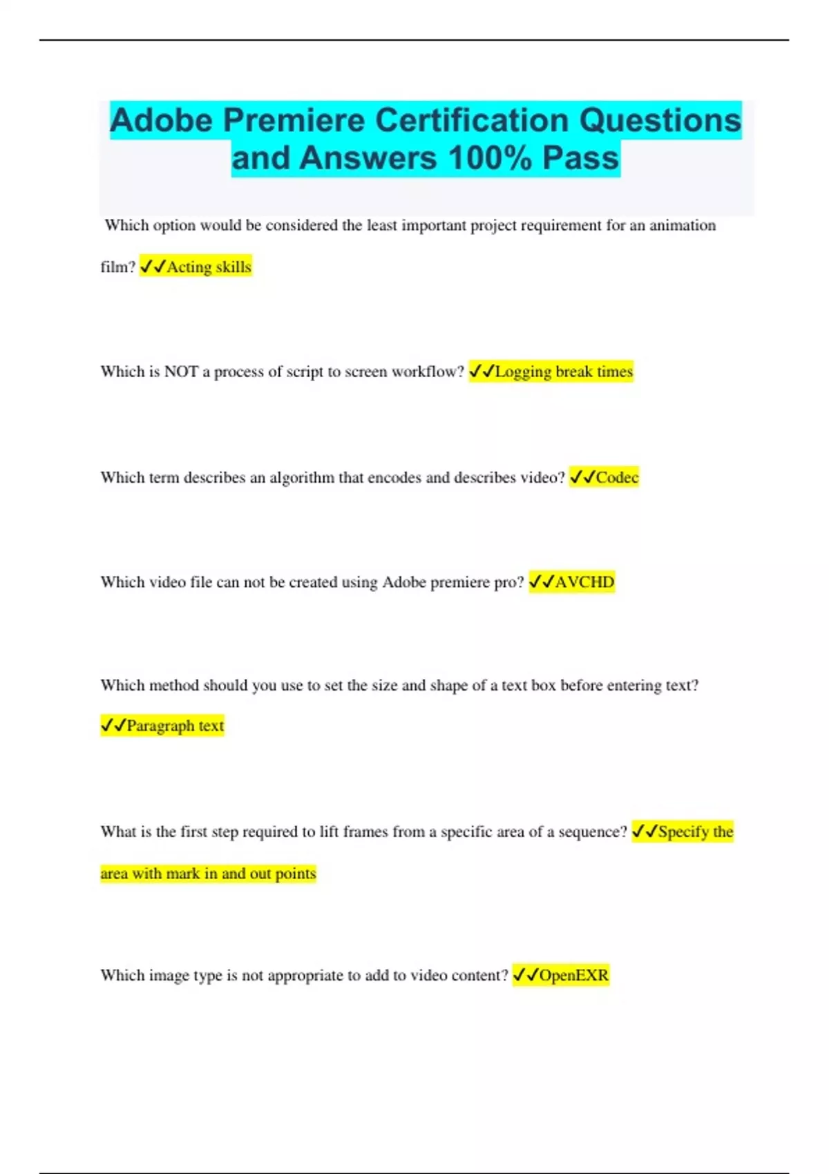 Adobe Premiere Certification Questions and Answers 100% Pass Which option would be considered the least important project requirement for an animation film? Acting skills Which is NOT a process of script to screen workflow? Logging break times Which term describes an algorithm that encodes and describes video? Codec Which video file can not be created using Adobe premiere pro? AVCHD Which method should you use to set the size and shape of a text box before entering text? Paragraph text What is the first step required to lift frames from a specific area of a sequence? Specify the area with mark in and out points Which image type is not appropriate to add to video content? OpenEXR Which software can be used to collaborate with clients or peers while script writing? Adobe story WHat is not a sequence category for organizing movie clips? Plot turn What displays how your final project will look like? Program monitor What point should you start discussing your design and content with clients? Treatment phase What term is used to describe raw footage? Dailies What is not likely to appear in the production plan? Director biography Which option lets you export a single frame? Click the export frame button Three features available in the project panel that are used for organizing and accessing media assets? 1) Searching for files 2) Color encoding 3) Scrubbing thumbnails Which two menu options would be used to import tape less media? 1) Window > media browser 2) File > import Which method should you use to increase the volume of an audio clip after expanding the audio track in the timeline Drag the volume line upward with the selection tool Which tool should you use to select, drag, and drop clips? Selection tool What option ensure you are not violating any copyright laws? 1) Obtaining permission from composure 2) Buying royalty free music 3) Creating your own music What tools can be used to create a storyboard illustration? 1) Adobe Illustrator 2) Adobe Photoshop Which type of video genre would benefit the most from the Warp Stabilizer, multicam editing, and dynamic timeline trimming features in unison? Action/Adventure Your client needs his field technicians to be able to easily view troubleshooting video clips on their smart phones. Which option is NOT a consideration you must take into account? Audience You need to develop a video that teaches uses how to set up their email. What is NOT a legal source for explaining the steps for setting up users' email? Copy and paste the steps off of the email software's website. You are creating a shot list for your current project. Which item will you NOT include on your shot list. Storyboard In which organizing sequence would a clip marking a change in the protagonist's affairs be categorized into? Climax Which statement is NOT true about an establishing shot in filmmaking? It is used when showing the reaction of a character to an event in the story line. What are three purposes of sound effects? (Choose three.) A. Simulate reality B. Create an illusion E. Set the mood Which option is NOT true of nested sequences? You cannot reuse sequences. Which two video formats would you export your media file as if you wanted a Flash video? (Choose two.) B. FLV D. F4V Which two factors should be considered when planning a project? (Choose two.) A. the purpose C. the target audience What are three parts of a video production plan? (Choose three.) A. Pre-Production C. Production D. Post-Production Which three steps are included in a basic video project workflow? (Choose three.) A. shoot the video B. plan the project C. capture the video Which type of camera shot establishes the subject in the context of the environment? D. extreme wide shot Which three methods should you use to fade in a video? B. Apply a cross dissolve effect. C. Adjust the key frames of opacity in the video track. D. Adjust the key frames of opacity in the effects control panel. Which tool should you use to split a clip and create a cut point? B. Razor Tool What is the name of the first frame included in the sequence when editing video? B. In Point How is a sequence nested into another sequence? A. Drag the nested sequence from the Project panel to the Timeline panel. Which crossfade transition creates a smooth and gradual transition between audio clips? B. Constant Gain Which option should you use in the Roll/Crawl dialog box if you want the text to move vertically? A. Roll How would you accelerate change with bezier handles? C. Move the handle up with the Selection tool.