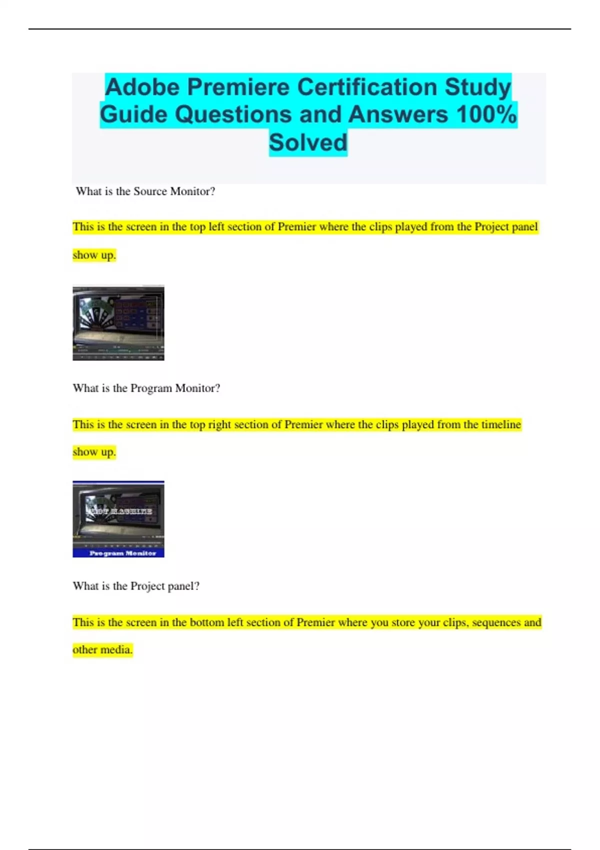 Adobe Premiere Certification Study Guide Questions and Answers 100% Solved What is the Source Monitor? This is the screen in the top left section of Premier where the clips played from the Project panel show up. What is the Program Monitor? This is the screen in the top right section of Premier where the clips played from the timeline show up. What is the Project panel? This is the screen in the bottom left section of Premier where you store your clips, sequences and other media. What is icon view in the Project panel? This is where your clips show up as tiny images (icons) in the Project panel. Click on the button in the lower left hand side of the Project panel (as shown above) to achieve this layout. What is the list view in the Project panel? This is where your clips show up as names only in a list in the Project panel. Click on the button in the lower left hand side of the Project panel (as shown above) to achieve this layout. What is the Selection Tool? Use this tool in the Tool Bar to select object such as clips. For example, once you've selected a clip, you can move your mouse to the left to shorten the clip or move your mouse to the right to elongate the clip. Press "V" on the keyboard for the shortcut key. What is the Pen Tool? Use this tool in the Tool Bar, for example, to create keyframes on the opacity curve of a title to fade up and down on the text. Press "P" on the keyboard for the shortcut key. What are keyframes? A key frame in animation and filmmaking is a drawing that defines the starting and ending points of any smooth transition. For example, drawing keyframes on a title clip to fade up and down on the text. What is the Razor Tool? Use this tool in the Tool Bar to slice a clip. Press "C" on the keyboard for the shortcut key. What is the Track Select Tool? Use this tool to highlight whole tracks such Video 1/Audio 1. Press "A" on the keyboard for the shortcut key. What are 4 ways to import media? 1. File >> Import 2. Command - I 3. Media Browser (shown here) 4. Double click on an empty space in the Project panel. What are 2 ways to export media? 1. File >> Export >> Media 2. Command - M What are 3 ways to save your work? 1. File >> Save 2. Command - S 3. File >> Save As Save your work EVERY 5 MINUTES, so you don't lose any of your work. What are two ways to mark an in point? 1. Press the Mark In button (shown here). 2. Press "I" on your keyboard. What are two ways to mark an out point? 1. Press the Mark Out button (shown here). 2. Press "O" on your keyboard. What are the two ways to do an Overwrite edit? 1. Press the Overwrite button (shown here). 2. Press the period button (.) on the keyboard. What are the two ways to do an Insert edit? 1. Press the Insert button (show here). 2. Press the comma button (,) What tracks are "armed" in this image? Video 1/Audio 1 What tracks are armed in this image? Video 2/Audio 2 How do you arm a track? Move the V block to the appropriate video track and highlight that track. Move the A1 block to the appropriate audio track and highlight that particular track. Deselect all other tracks. What is the Marker button? Use this button to mark a spot on a clip. For example, in a song, you would mark the bass hits on the audio track to then edit to the beat of the music. What are these points called on the track? Markers