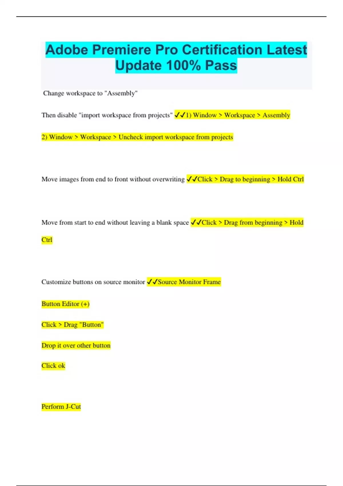 Adobe Premiere Pro Certification Latest Update 100% Pass Change workspace to "Assembly" Then disable "import workspace from projects" 1) Window > Workspace > Assembly 2) Window > Workspace > Uncheck import workspace from projects Move images from end to front without overwriting Click > Drag to beginning > Hold Ctrl Move from start to end without leaving a blank space Click > Drag from beginning > Hold Ctrl Customize buttons on source monitor Source Monitor Frame Button Editor (+) Click > Drag "Button" Drop it over other button Click ok Perform J-Cut Cut about halfway Hoer over beginning of clip till mouse changes to hand Hold ALT Click > Drag > Halfway Add a volume keyframe Hold Ctrl > Click anywhere on the center line that runs through audio Apply lighting effect Project frame (bottom left) Scrolling bar > Effects Generate > Lightning Export the sequence as video only using AVI format File > Export> Media> Format: AVI Uncheck: Export Audio Click Export Export: In/Out Sequence AVI Format Use Frame blending File > Export> Media> Format: AVI Check: Frame Blending Sequence range: Sequence In/Out Click Export Which of the following effect option can be used to create a Green screen effect known as Chroma Key? Ultra Key When creating a new project, how can you choose the location where your project will be saved? Clicking the browse button next to the location input box Which of the following is an accurate description of a nested sequence? Combining multiple video sequences into one master sequence Which of the following methods allow you to create a new sequence from clip? (Choose two) 1) Drag and drop a clip into a "New Item" button 2) File > New > Sequence from Clip What will happen if you click and drag a video transition effect from the effects panel onto a video clip? It will apply the transition effect to the video clip Which of the following correctly describes a video sequence? A group of video clips and audio laid out in the workspace Which of the following is an audio production technique that is not a part of the narrative and is also known as off stage commentary? Voice Over When viewing a clip in the project panel, which view allows you to see information such as frame rate and video in and out point? List View Inside of which panel can you add or remove video clips to the sequence? Timeline Panel Which of the following uses a cutaway technique to show footage that is separate from the narrative, also called supplemental footage? B-Roll Footage Remove only the audio portion Lock Video