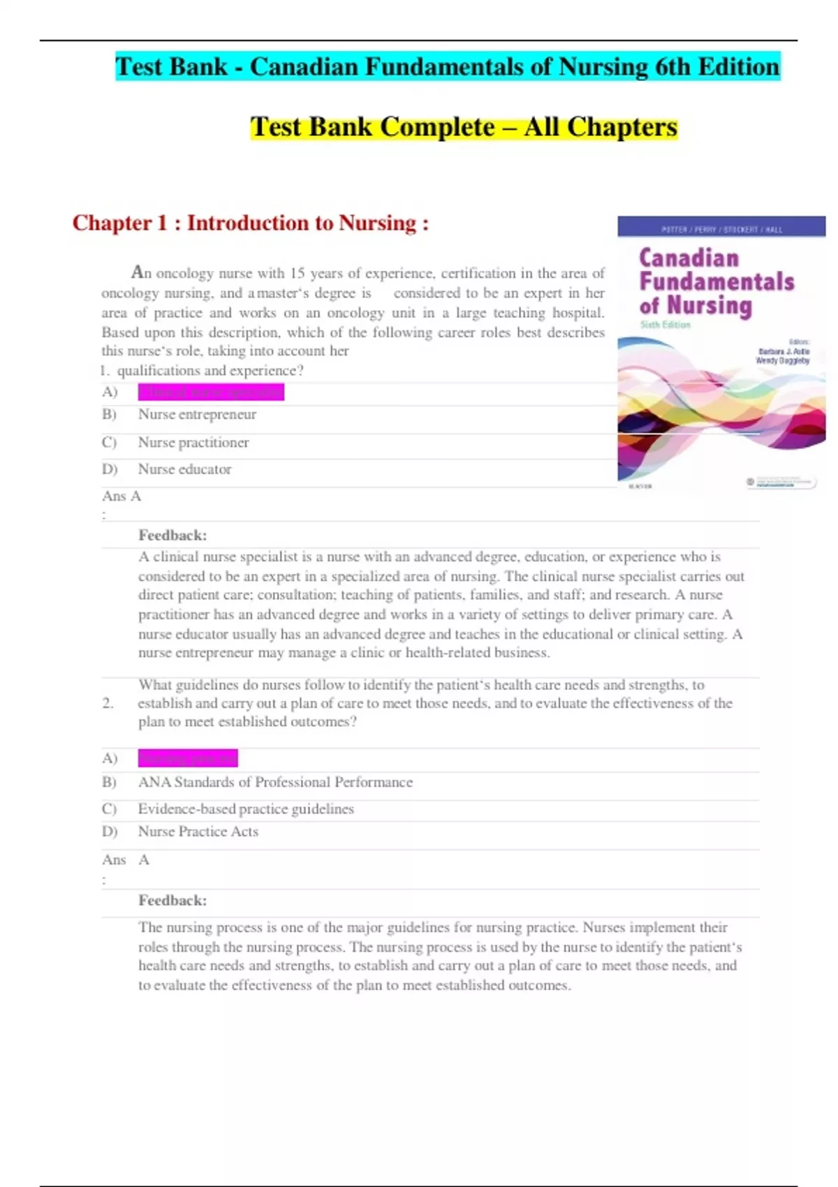 Canadian Fundamentals of Nursing 6th Edition by Potter All chapters 1-48 Test Bank