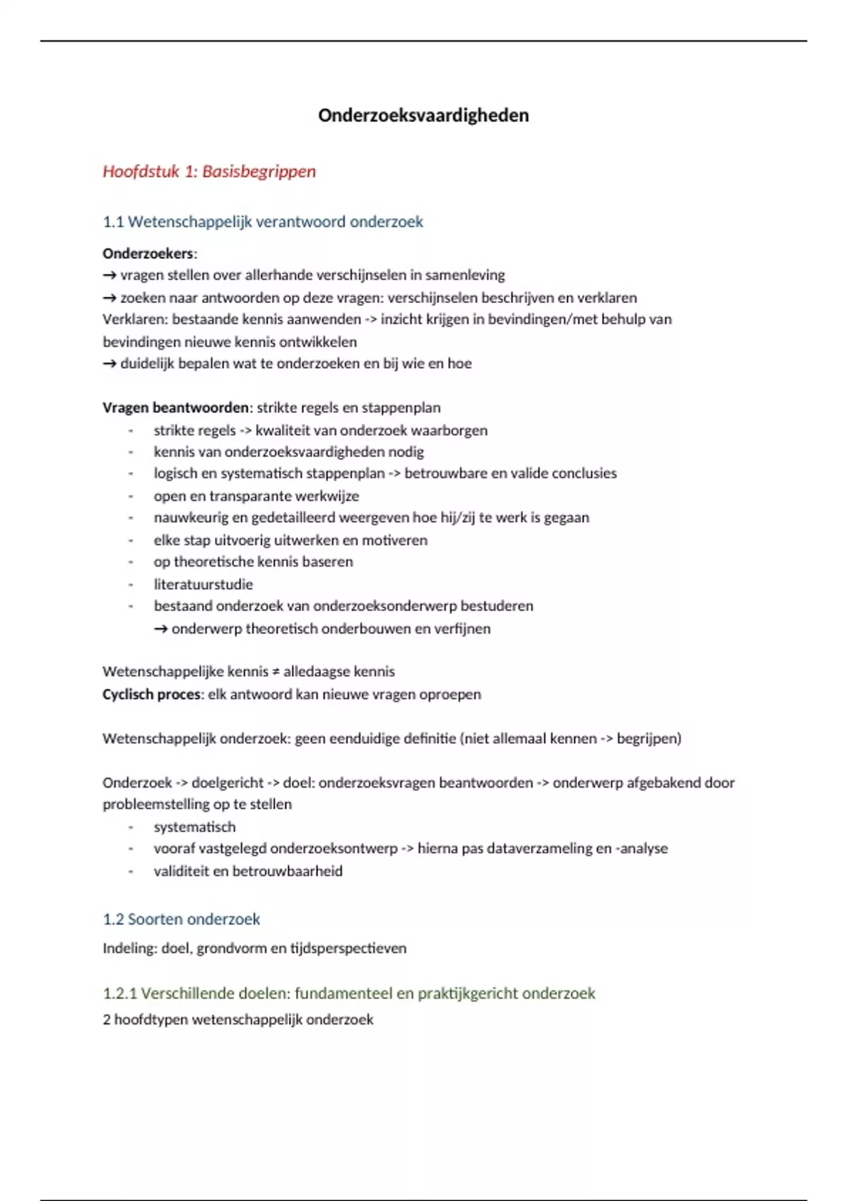 Dit is een uitgebreide, volledige samenvatting van onderzoeksvaardigheden 1. Ik zit in het eerste jaar toegepaste psychologie. Hieronder ziet u welk boek ik heb en welke hoofdstukken ik heb behandeld in deze samenvatting. Boek: onderzoeksvaardigheden (van in) geschreven door Caroline Neckebroeck, Inge Vanderstraeten, Mieke Verhaeghe (vierde editie) H1: basisbegrippen H2: het onderzoeksplan H3: steekproeftrekking H4: kwantitatief onderzoek via enquêtes H5: data-analyse in kwantitatief onderzoek H6: kwalitatief onderzoek via interviews en focusgroepen H7: data-analyse in kwalitatief onderzoek H8: de rapportage