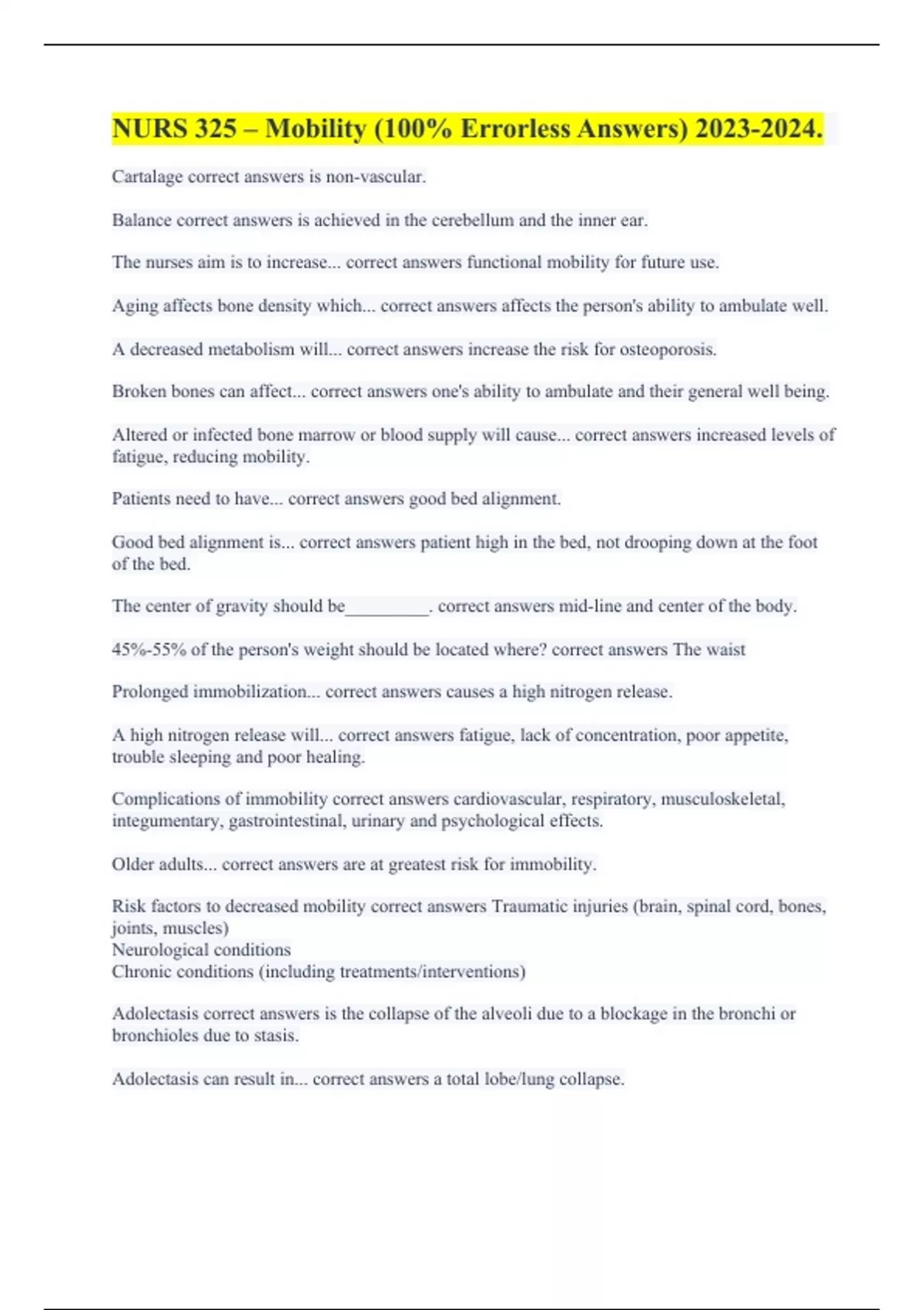 NURS 325 – Mobility (100% Errorless Answers) .