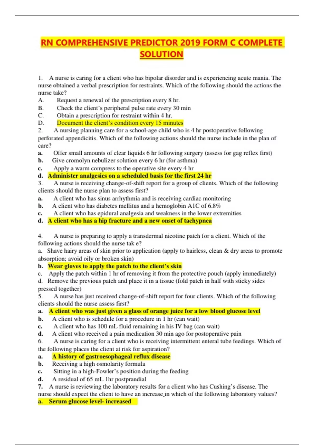 RN COMPREHENSIVE PREDICTOR 2019 FORM C COMPLETE SOLUTION 1. A nurse is caring for a client who has bipolar disorder and is experiencing acute mania. The nurse obtained a verbal prescription for restraints. Which of the following should the actions the nurse take? A. Request a renewal of the prescription every 8 hr. B. Check the client’s peripheral pulse rate every 30 min C. Obtain a prescription for restraint within 4 hr. D. Document the client’s condition every 15 minutes 2. A nursing planning care for a school-age child who is 4 hr postoperative following perforated appendicitis. Which of the following actions should the nurse include in the plan of care? a. Offer small amounts of clear liquids 6 hr following surgery (assess for gag reflex first) b. Give cromolyn nebulizer solution every 6 hr (for asthma) c. Apply a warm compress to the operative site every 4 hr d. Administer analgesics on a scheduled basis for the first 24 hr 3. A nurse is receiving change-of-shift report for a group of clients. Which of the following clients should the nurse plan to assess first? a. A client who has sinus arrhythmia and is receiving cardiac monitoring b. A client who has diabetes mellitus and a hemoglobin A1C of 6.8% c. A client who has epidural analgesia and weakness in the lower extremities d. A client who has a hip fracture and a new onset of tachypnea 4. A nurse is preparing to apply a transdermal nicotine patch for a client. Which of the following actions should the nurse tak e? a. Shave hairy areas of skin prior to application (apply to hairless, clean & dry areas to promote absorption; avoid oily or broken skin) b. Wear gloves to apply the patch to the client’s skin c. Apply the patch within 1 hr of removing it from the protective pouch (apply immediately) d. Remove the previous patch and place it in a tissue (fold patch in half with sticky sides pressed together) 5. A nurse has just received change-of-shift report for four clients. Which of the following clients should the nurse assess first? a. A client who was just given a glass of orange juice for a low blood glucose level b. A client who is schedule for a procedure in 1 hr (can wait) c. A client who has 100 mL fluid remaining in his IV bag (can wait) d. A client who received a pain medication 30 min ago for postoperative pain 6. A nurse is caring for a client who is receiving intermittent enteral tube feedings. Which of the following places the client at risk for aspiration? a. A history of gastroesophageal reflux disease b. Receiving a high osmolarity formula c. Sitting in a high-Fowler’s position during the feeding d. A residual of 65 mL 1hr postprandial 7. A nurse is reviewing the laboratory results for a client who has Cushing’s disease. The nurse should expect the client to have an increase in which of the following laboratory values? a. Serum glucose level- increased b. Serum calcium level-decreased c. Lymphocyte count- decreased immune system. d. Serum potassium level- decreased . 8. A nurse is caring for a client who has severe preeclampsia and is receiving magnesium sulfate intravenously. The nurse discontinues the magnesium sulfate after the client displaces toxicity. Which of the following actions should the nurse take? a. Position the client supine b. Prepare an IV bolus of dextrose 5% in water c. Administer methylergonovine IM d. Administer calcium gluconate IV Calcium gluconate is given for magnesium sulfate toxicity. Always have an injectable form of calcium gluconate available when administering magnesium sulfate by IV. 9. A charge nurse is teaching new staff members about factors that increase a client’s risk to become violent. Which of the following risk factors should the nurse include as the best predictor of future violence? a. Experiencing delusions b. Male gender c. Previous violent behavior d. A history of being in prison Risk factors also include: past history of aggression, poor impulse control, and violence. Comorbidity that leads to acts of violence (psychotic delusions, command hallucinations, violent angry reactions with cognitive disorders). Individual Assessment for Violence 10. A nurse is preparing to perform a sterile dressing change. Which of the following actions should the nurse take when setting up the sterile field? a. Place the cap from the solution sterile side up on clean surface b. Open the outermost flap of the sterile kit toward the body→ flap AWAY from the body's first c. Place the sterile dressing within 1.25 cm (0.5in) of the edge of the sterile field → 2.5 cm (1-inch) border around any sterile drape or wrap that is considered contaminated. d. Set up the sterile field 5 cm (2 in) below waist level→ it says BELOW waist level; should be ABOVE waist level 11. A nurse is providing teaching to an older adult client about methods to promote nighttime sleep. Which of the following instructions should the nurse include? a. Eat a light snack before bedtime b. Stay in bed at least 1 hr if unable to fall asleep c. Take a 1 hr nap during the day d. Perform exercises prior to bedtime 12. A home health nurse is preparing for an initial visit with an older adult client who lives alone. Which of the following actions should the nurse take first? a. Educate the client about current medical diagnosis b. Refer the client to a meal delivery program c. Identify environmental hazards in the home d. Arrange for client transportation to follow-up appointments Rationale Priority: Assess first. 13. A nurse is assessing the remote memory of an older adult client who has mild dementia. Which of the following questions should the nurse ask the client? a. “Can you tell me who visited you today?” b. “What high school did you graduate from c. “Can you list your current medications?” d. “What did you have for breakfast yesterday?” 14. A nurse is providing teaching to an adolescent who has type 1 diabetes mellitus. Which of the following goals should the nurse include in the teaching a. HbA1c 