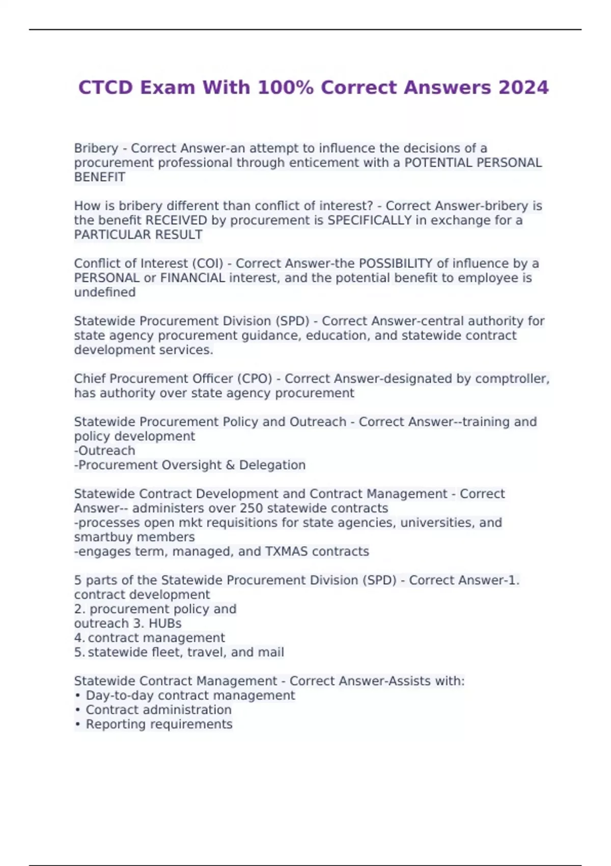 CTCD Exam With 100% Correct Answers 2024 Bribery - Correct Answer-an attempt to influence the decisions of a procurement professional through enticement with a POTENTIAL PERSONAL BENEFIT