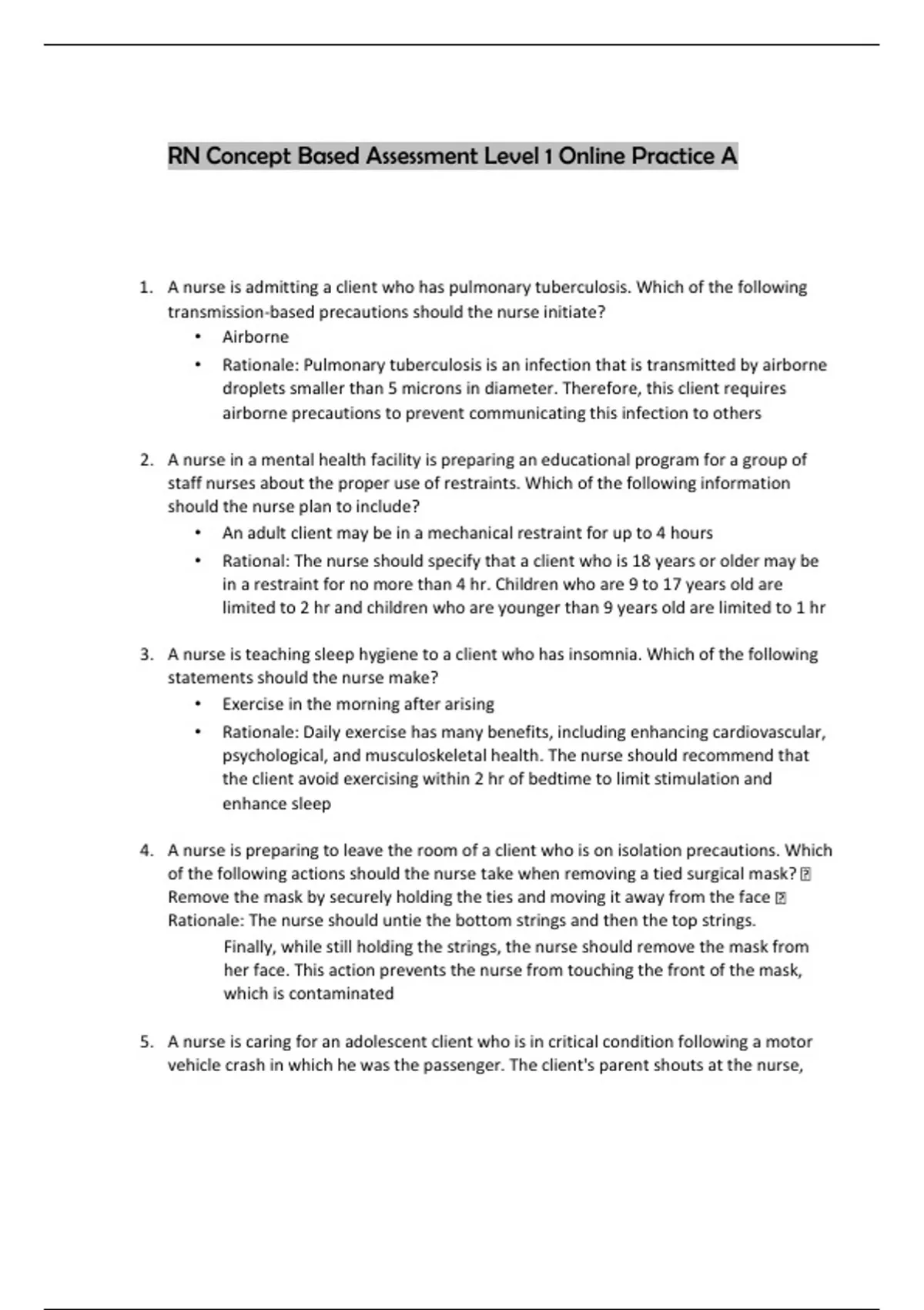 RN Concept Based Assessment Level 1 Online Practice A