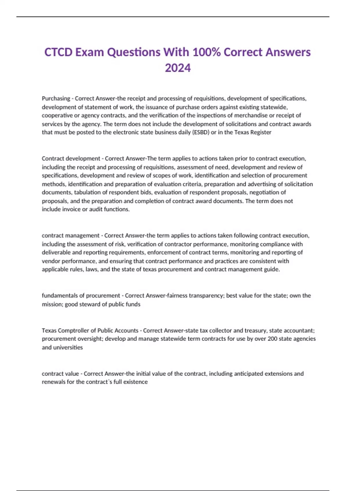 CTCD Exam Questions With 100% Correct Answers 2024 Purchasing - Correct Answer-the receipt and processing of requisitions, development of specifications, development of statement of work, the issuance of purchase orders against existing statewide, cooperative or agency contracts, and the verification of the inspections of merchandise or receipt of services by the agency. The term does not include the development of solicitations and contract awards that must be posted to the electronic state business daily (ESBD) or in the Texas Register