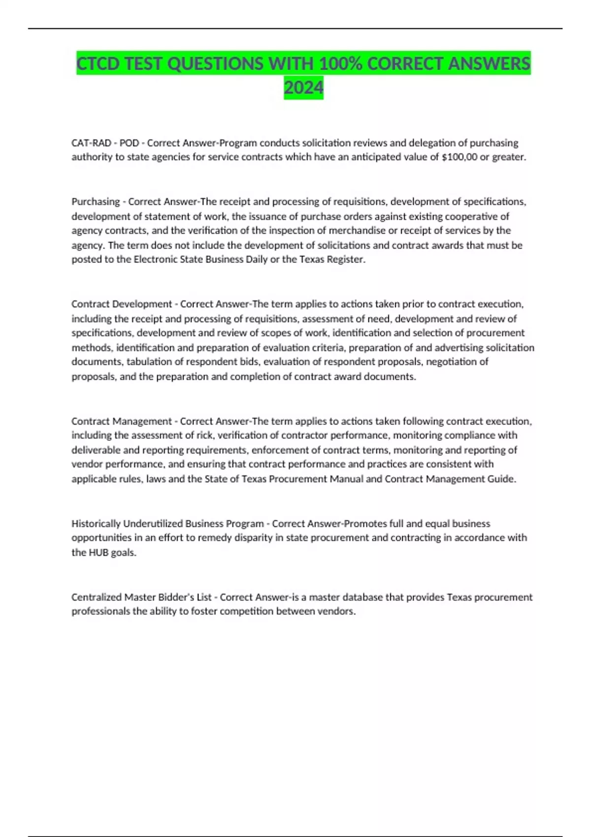 CTCD TEST QUESTIONS WITH 100% CORRECT ANSWERS 2024 CAT-RAD - POD - Correct Answer-Program conducts solicitation reviews and delegation of purchasing authority to state agencies for service contracts which have an anticipated value of $100,00 or greater.