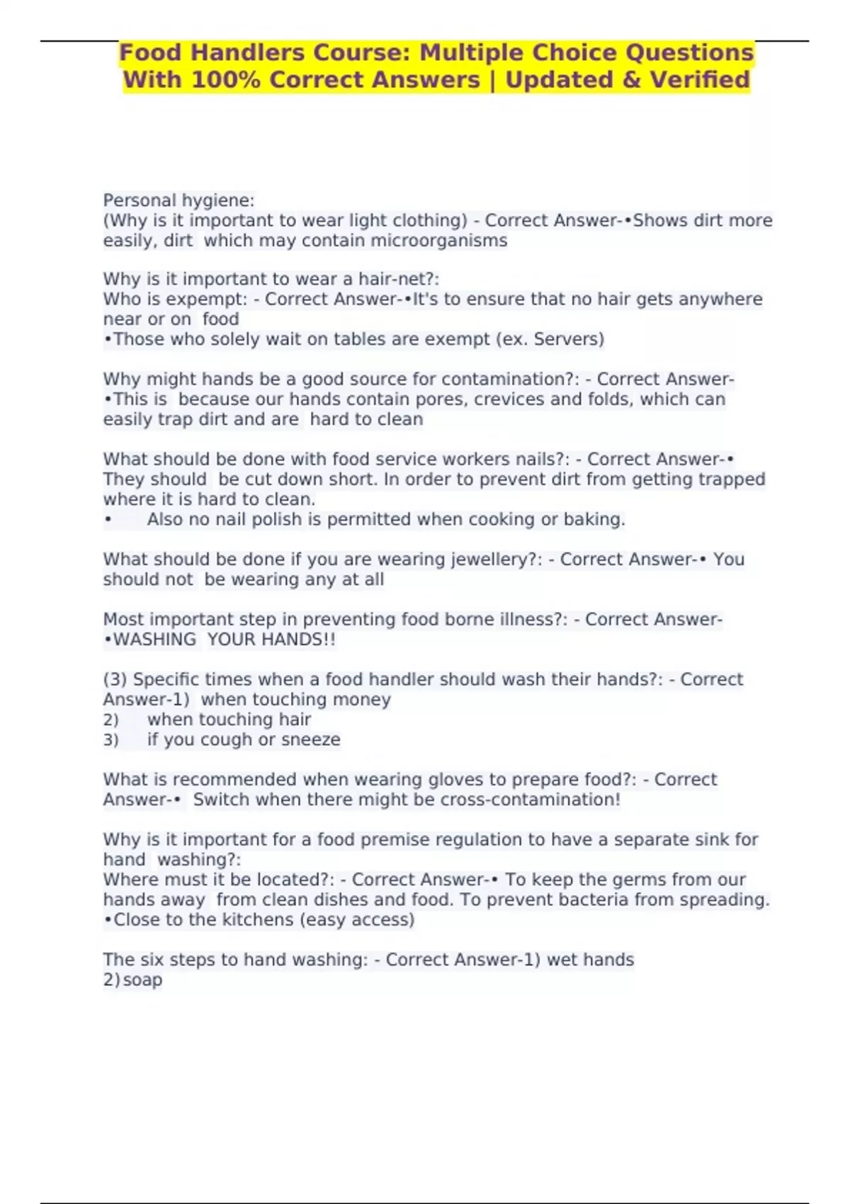 Food Handlers Course: Multiple Choice Questions With 100% Correct Answers | Updated & Verified Personal hygiene: (Why is it important to wear light clothing) - Correct Answer-•Shows dirt more easily, dirt which may contain microorganisms