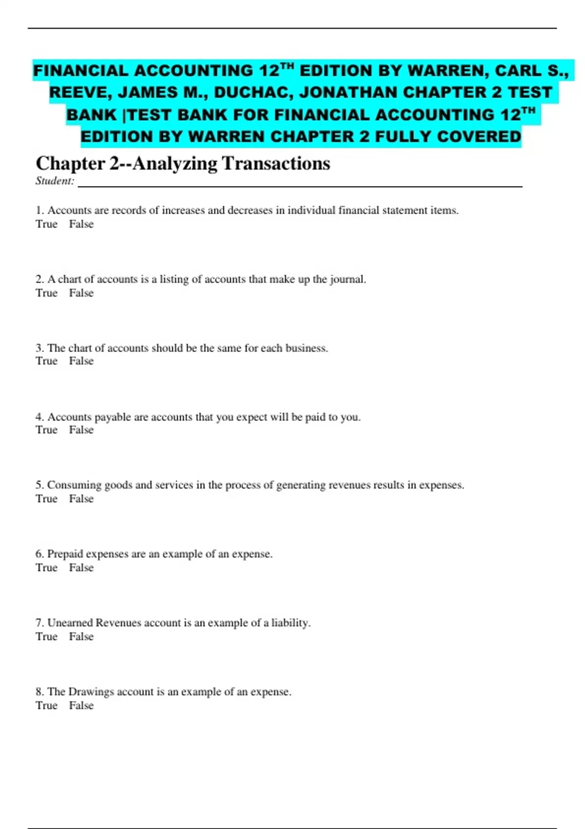FINANCIAL ACCOUNTING 12TH EDITION BY WARREN, CARL S., REEVE, JAMES M., DUCHAC, JONATHAN CHAPTER 2 TEST BANK |TEST BANK FOR FINANCIAL ACCOUNTING 12TH EDITION BY WARREN CHAPTER 2 FULLY COVERED