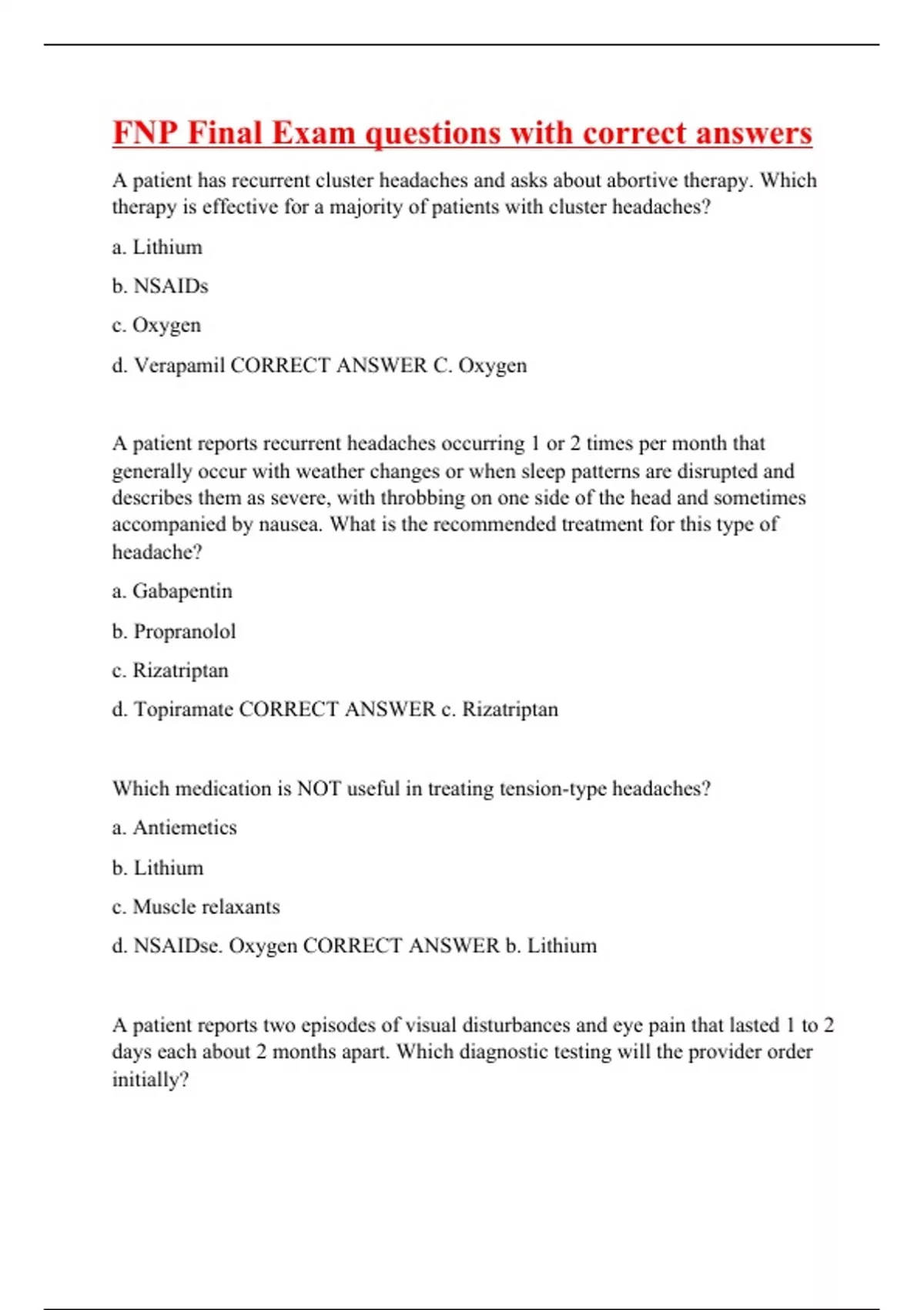 A patient has recurrent cluster headaches and asks about abortive therapy. Which therapy is effective for a majority of patients with cluster headaches? a. Lithium b. NSAIDs c. Oxygen d. Verapamil CORRECT ANSWER C. Oxygen A patient reports recurrent headaches occurring 1 or 2 times per month that generally occur with weather changes or when sleep patterns are disrupted and describes them as severe, with throbbing on one side of the head and sometimes accompanied by nausea. What is the recommended treatment for this type of headache? a. Gabapentin b. Propranolol c. Rizatriptan d. Topiramate CORRECT ANSWER c. Rizatriptan Which medication is NOT useful in treating tension-type headaches? a. Antiemetics b. Lithium c. Muscle relaxants d. NSAIDse. Oxygen CORRECT ANSWER b. Lithium A patient reports two episodes of visual disturbances and eye pain that lasted 1 to 2 days each about 2 months apart. Which diagnostic testing will the provider order initially?
