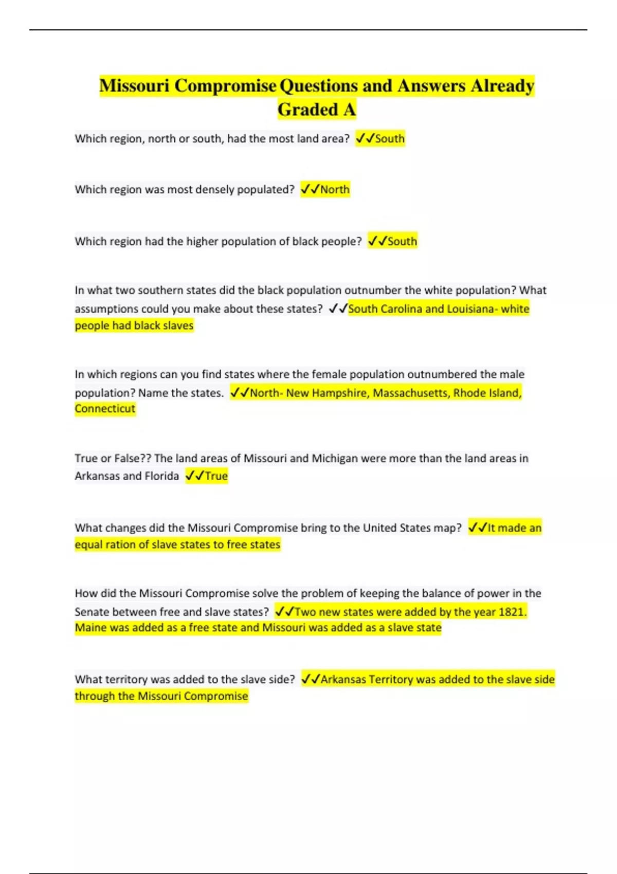 Missouri Compromise Questions and Answers Already Graded A Which region, north or south, had the most land area? South Which region was most densely populated? North Which region had the higher population of black people? South In what two southern states did the black population outnumber the white population? What assumptions could you make about these states? South Carolina and Louisiana- white people had black slaves In which regions can you find states where the female population outnumbered the male population? Name the states. North- New Hampshire, Massachusetts, Rhode Island, Connecticut True or False?? The land areas of Missouri and Michigan were more than the land areas in Arkansas and Florida True What changes did the Missouri Compromise bring to the United States map? It made an equal ration of slave states to free states How did the Missouri Compromise solve the problem of keeping the balance of power in the Senate between free and slave states? Two new states were added by the year 1821. Maine was added as a free state and Missouri was added as a slave state What territory was added to the slave side? Arkansas Territory was added to the slave side through the Missouri Compromise