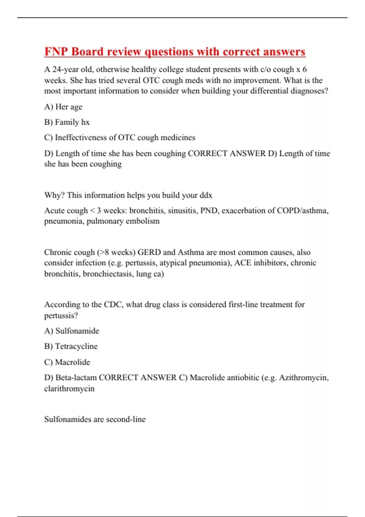 A 24-year old, otherwise healthy college student presents with c/o cough x 6 weeks. She has tried several OTC cough meds with no improvement. What is the most important information to consider when building your differential diagnoses? A) Her age B) Family hx C) Ineffectiveness of OTC cough medicines D) Length of time she has been coughing CORRECT ANSWER D) Length of time she has been coughing Why? This information helps you build your ddx Acute cough < 3 weeks: bronchitis, sinusitis, PND, exacerbation of COPD/asthma, pneumonia, pulmonary embolism Chronic cough (>8 weeks) GERD and Asthma are most common causes, also consider infection (e.g. pertussis, atypical pneumonia), ACE inhibitors, chronic bronchitis, bronchiectasis, lung ca) According to the CDC, what drug class is considered first-line treatment for pertussis? A) Sulfonamide B) Tetracycline C) Macrolide
