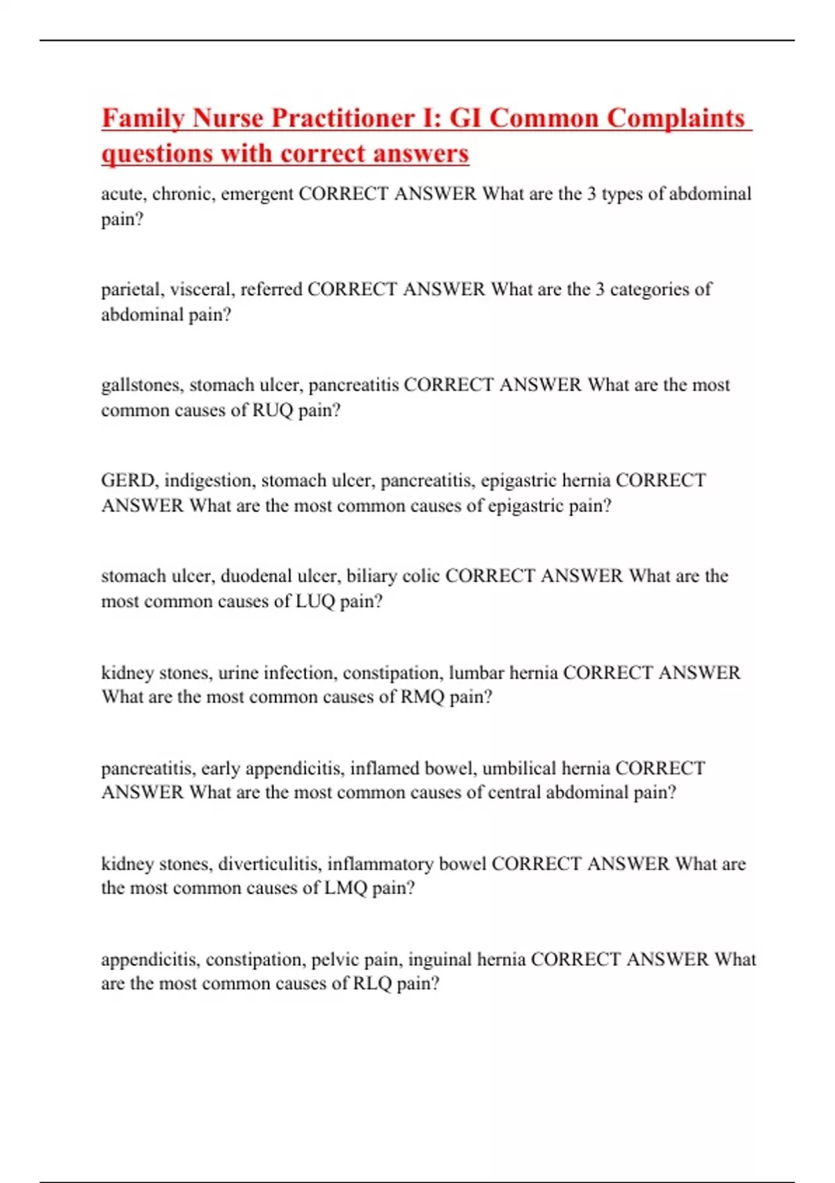 Family Nurse Practitioner I: GI Common Complaints questions with correct answers