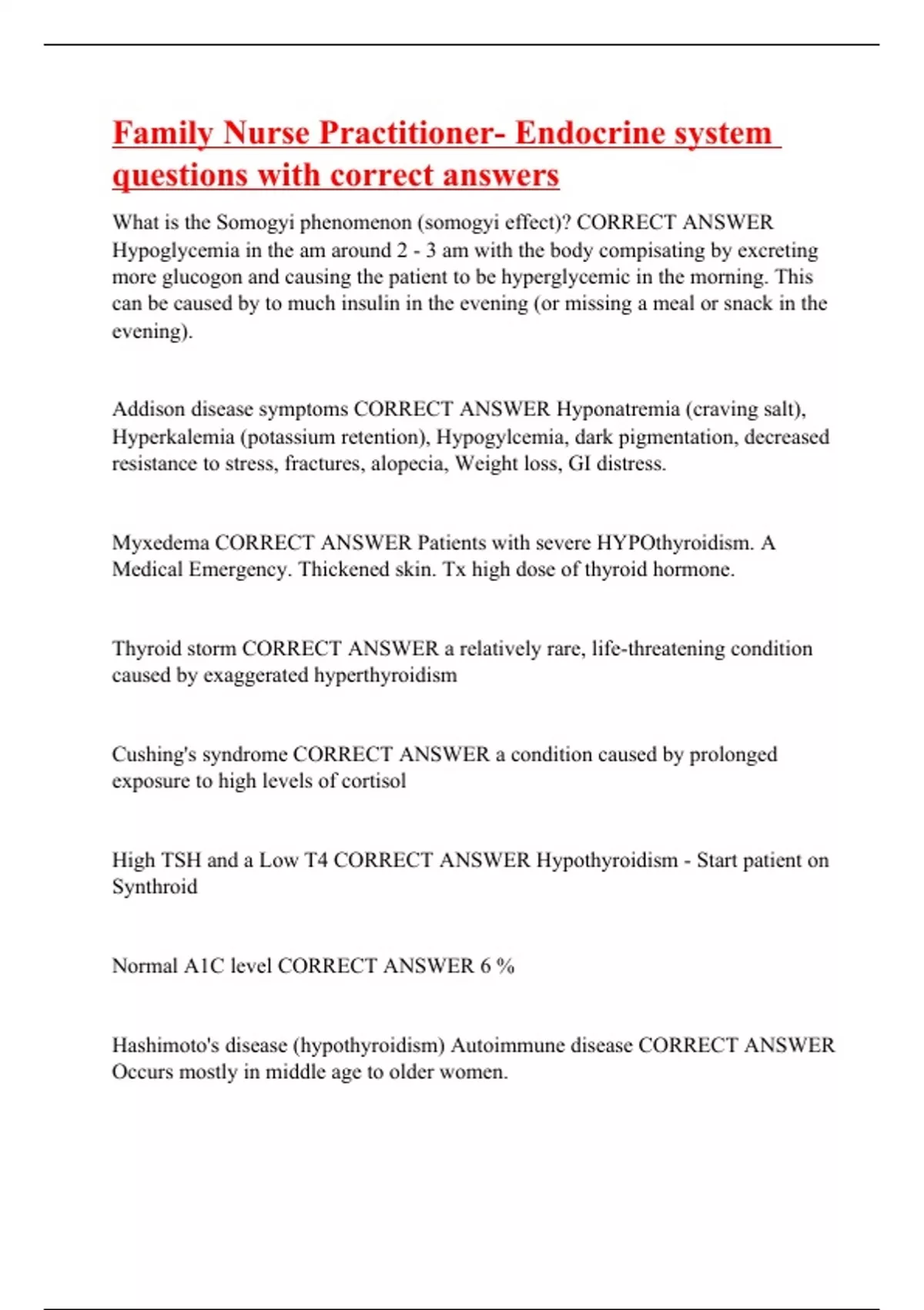 What is the Somogyi phenomenon (somogyi effect)? CORRECT ANSWER Hypoglycemia in the am around 2 - 3 am with the body compisating by excreting more glucogon and causing the patient to be hyperglycemic in the morning. This can be caused by to much insulin in the evening (or missing a meal or snack in the evening). Addison disease symptoms CORRECT ANSWER Hyponatremia (craving salt), Hyperkalemia (potassium retention), Hypogylcemia, dark pigmentation, decreased resistance to stress, fractures, alopecia, Weight loss, GI distress. Myxedema CORRECT ANSWER Patients with severe HYPOthyroidism. A Medical Emergency. Thickened skin. Tx high dose of thyroid hormone. Thyroid storm CORRECT ANSWER a relatively rare, life-threatening condition caused by exaggerated hyperthyroidism Cushing's syndrome CORRECT ANSWER a condition caused by prolonged exposure to high levels of cortisol High TSH and a Low T4 CORRECT ANSWER Hypothyroidism - Start patient on Synthroid Normal A1C level CORRECT ANSWER 6