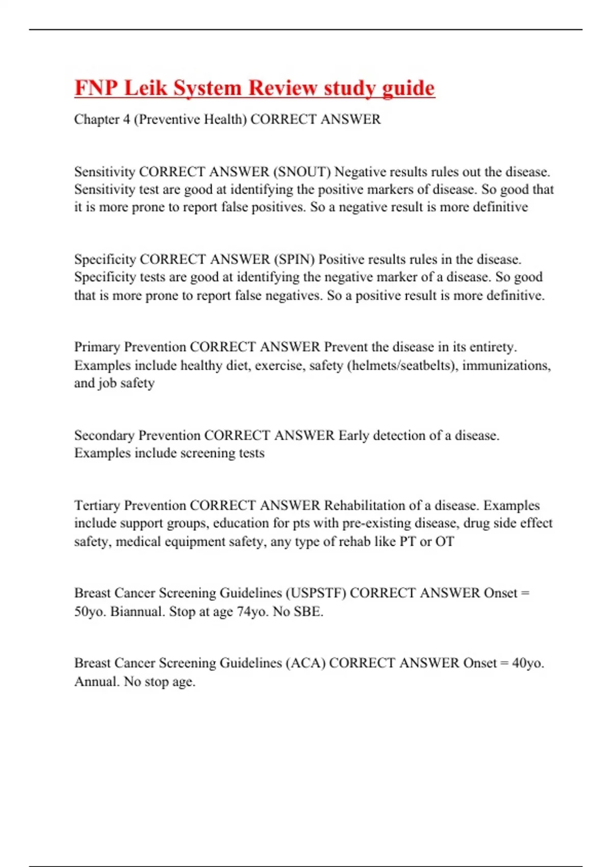 Chapter 4 (Preventive Health) CORRECT ANSWER Sensitivity CORRECT ANSWER (SNOUT) Negative results rules out the disease. Sensitivity test are good at identifying the positive markers of disease. So good that it is more prone to report false positives. So a negative result is more definitive Specificity CORRECT ANSWER (SPIN) Positive results rules in the disease. Specificity tests are good at identifying the negative marker of a disease. So good that is more prone to report false negatives. So a positive result is more definitive. Primary Prevention CORRECT ANSWER Prevent the disease in its entirety. Examples include healthy diet, exercise, safety (helmets/seatbelts), immunizations, and job safety Secondary Prevention CORRECT ANSWER Early detection of a disease. Examples include screening tests Tertiary Prevention CORRECT ANSWER Rehabilitation of a disease. Examples include support groups, education for pts with pre-existing disease, drug side effect safety, medical equipment safety, any type of rehab like PT or OT Breast Cancer Screening Guidelines (USPSTF) CORRECT ANSWER Onset = 50yo. Biannual. Stop at age 74yo. No SBE. Breast Cancer Screening Guidelines (ACA) CORRECT ANSWER Onset = 40yo. Annual. No stop age.