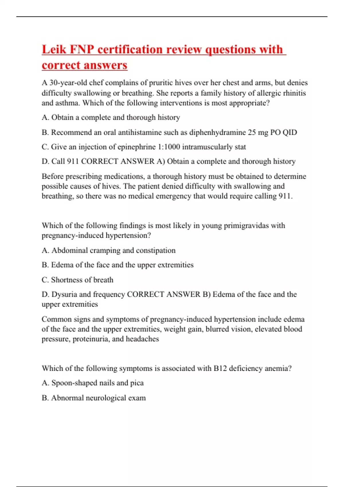 A 30-year-old chef complains of pruritic hives over her chest and arms, but denies difficulty swallowing or breathing. She reports a family history of allergic rhinitis and asthma. Which of the following interventions is most appropriate? A. Obtain a complete and thorough history B. Recommend an oral antihistamine such as diphenhydramine 25 mg PO QID C. Give an injection of epinephrine 1:1000 intramuscularly stat D. Call 911 CORRECT ANSWER A) Obtain a complete and thorough history Before prescribing medications, a thorough history must be obtained to determine possible causes of hives. The patient denied difficulty with swallowing and breathing, so there was no medical emergency that would require calling 911. Which of the following findings is most likely in young primigravidas with pregnancy-induced hypertension? A. Abdominal cramping and constipation B. Edema of the face and the upper extremities C. Shortness of breath D. Dysuria and frequency CORRECT ANSWER B) Edema of the face and the upper extremities Common signs and symptoms of pregnancy-induced hypertension include edema of the face and the upper extremities, weight gain, blurred vision, elevated blood pressure, proteinuria, and headac
