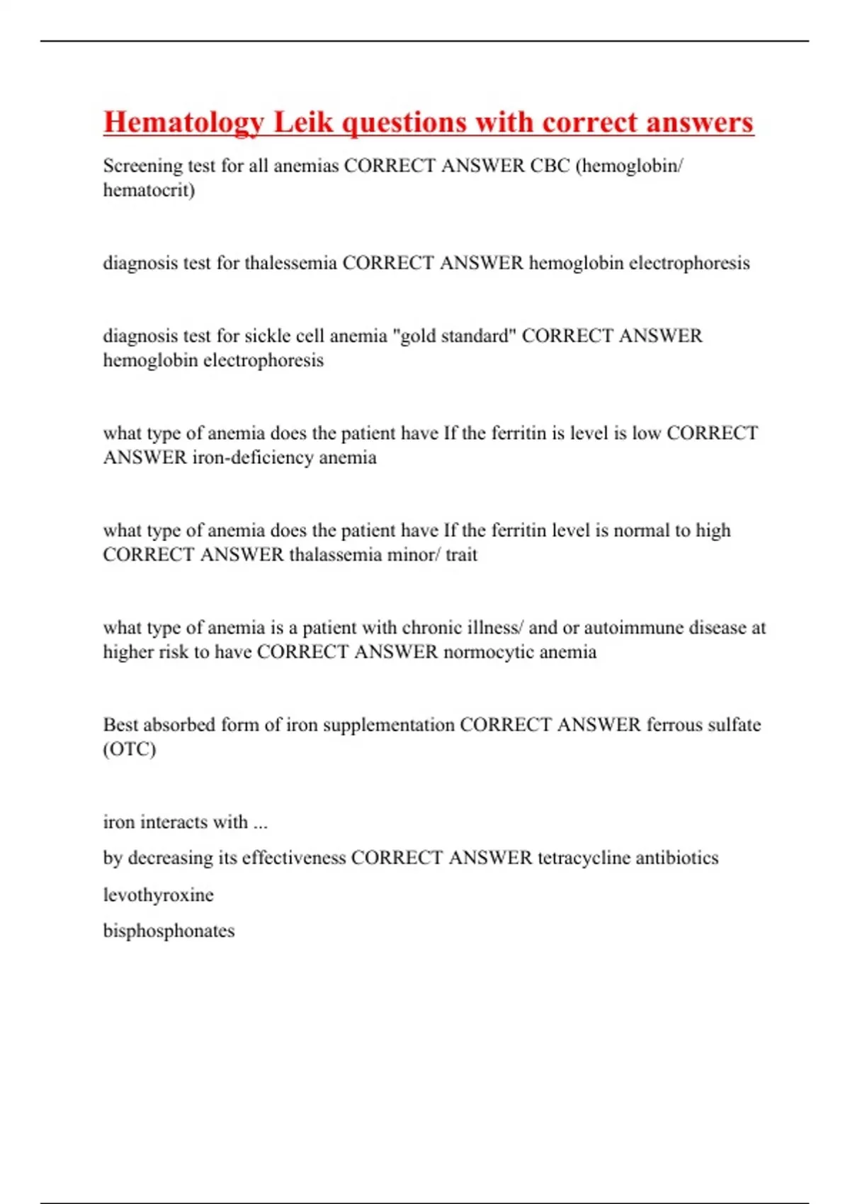 Screening test for all anemias CORRECT ANSWER CBC (hemoglobin/ hematocrit) diagnosis test for thalessemia CORRECT ANSWER hemoglobin electrophoresis diagnosis test for sickle cell anemia "gold standard" CORRECT ANSWER hemoglobin electrophoresis what type of anemia does the patient have If the ferritin is level is low CORRECT ANSWER iron-deficiency anemia what type of anemia does the patient have If the ferritin level is normal to high CORRECT ANSWER thalassemia minor/ trait what type of anemia is a patient with chronic illness/ and or autoimmune disease at higher risk to have CORRECT ANSWER normocytic anemia Best absorbed form of iron supplementation CORRECT ANSWER ferrous sulfate (OTC) iron interacts with ... by decreasing its effectiveness CORRECT ANSWER tetracycline antibiotics levothyroxine bisphosphonates How should a pt take iron when on antibi