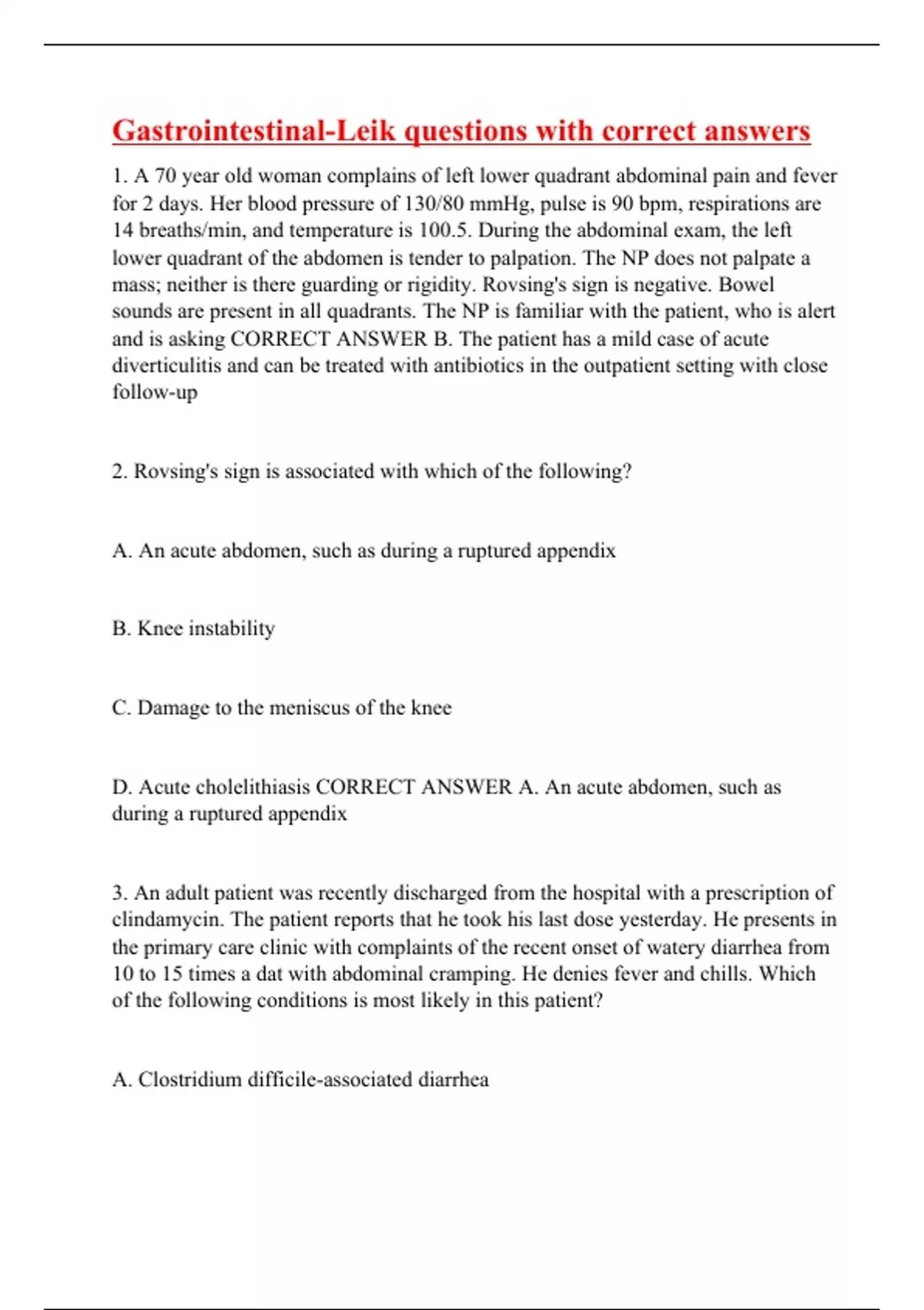 1. A 70 year old woman complains of left lower quadrant abdominal pain and fever for 2 days. Her blood pressure of 130/80 mmHg, pulse is 90 bpm, respirations are 14 breaths/min, and temperature is 100.5. During the abdominal exam, the left lower quadrant of the abdomen is tender to palpation. The NP does not palpate a mass; neither is there guarding or rigidity. Rovsing's sign is negative. Bowel sounds are present in all quadrants. The NP is familiar with the patient, who is alert and is asking CORRECT ANSWER B. The patient has a mild case of acute diverticulitis and can be treated with antibiotics in the outpatient setting with close follow-up 2. Rovsing's sign is associated with which of the following? A. An acute abdomen, such as during a ruptured appendix B. Knee instability C. Damage to the meniscus of the knee D. Acute cholelithiasis CORRECT ANSWER A. An acute abdomen, such as during a ruptured appendix 3. An adult patient was recently discharged from the hospital with a prescription of clindamycin. The patient reports that he took his last dose yesterday. He presents in the primary care clinic with complaints of the recent onset of watery diarrhea from 10 to 15 times a dat with abdominal cramping. He denies fever and chills. Which of the following conditions is most likely in this patient?