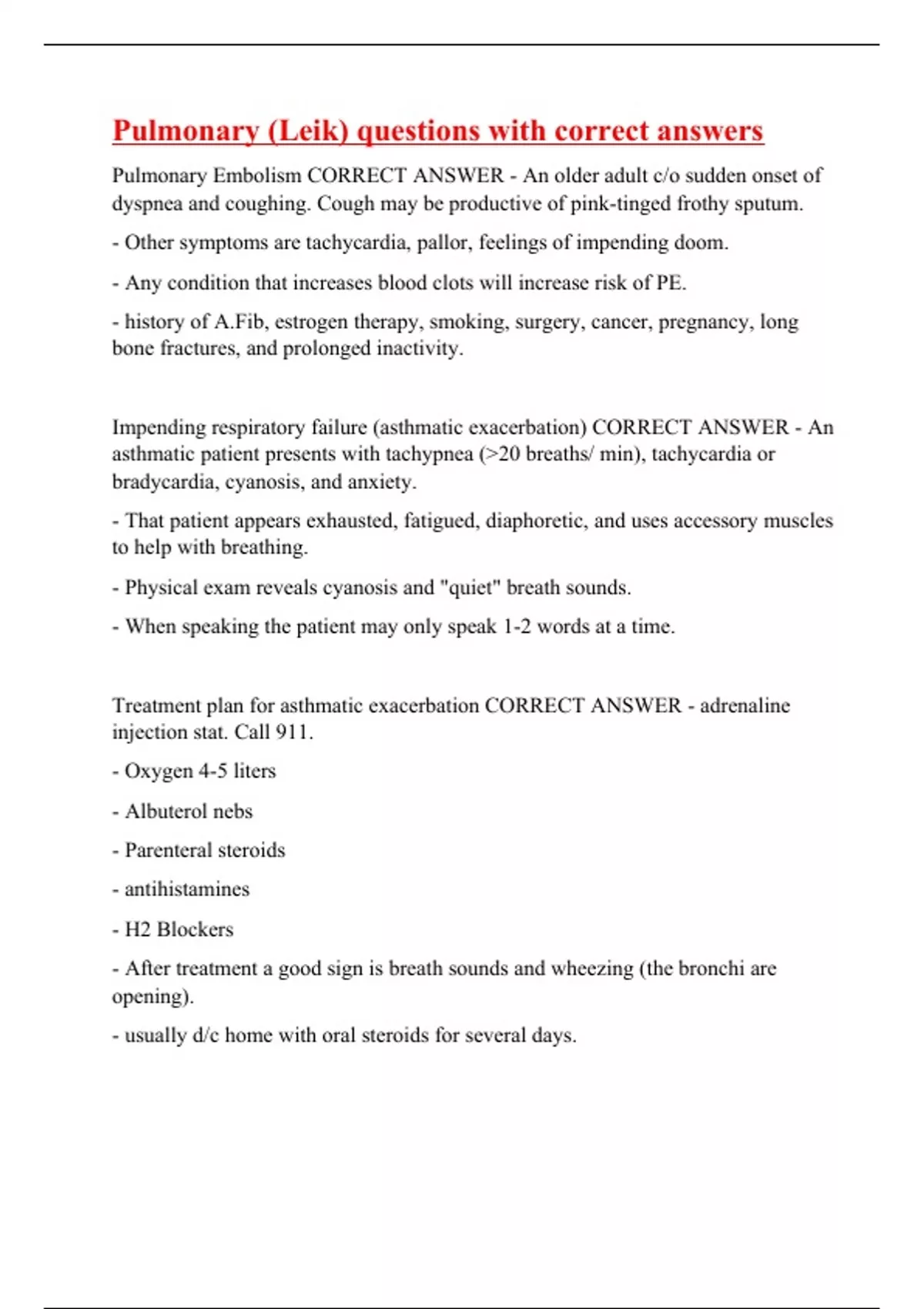Pulmonary Embolism CORRECT ANSWER - An older adult c/o sudden onset of dyspnea and coughing. Cough may be productive of pink-tinged frothy sputum. - Other symptoms are tachycardia, pallor, feelings of impending doom. - Any condition that increases blood clots will increase risk of PE. - history of A.Fib, estrogen therapy, smoking, surgery, cancer, pregnancy, long bone fractures, and prolonged inactivity. Impending respiratory failure (asthmatic exacerbation) CORRECT ANSWER - An asthmatic patient presents with tachypnea (>20 breaths/ min), tachycardia or bradycardia, cyanosis, and anxiety. - That patient appears exhausted, fatigued, diaphoretic, and uses accessory muscles to help with breathing. - Physical exam reveals cyanosis and "quiet" breath sounds. - When speaking the patient may only speak 1-2 words at a time. Treatment plan for asthmatic exacerbation CORRECT ANSWER - adrenaline injection stat. Call 911. - Oxygen 4-5 liters - Albuterol nebs - Parenteral steroids - antihistamines - H2 Blockers - After treatment a good sign is breath sounds and wheezing (the bronchi are opening). - usually d/c home with oral steroids for several days.