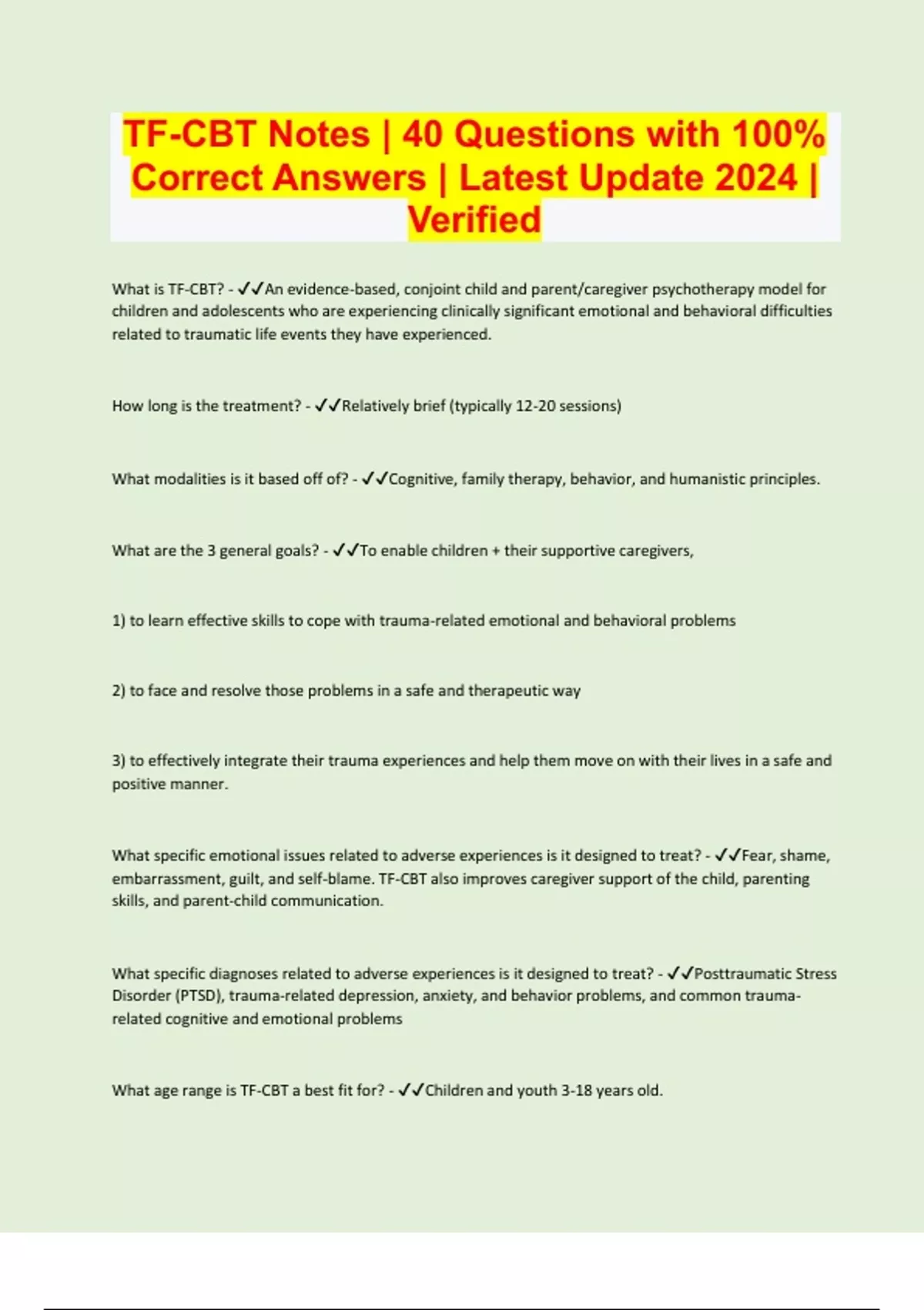 TF-CBT Notes | 40 Questions with 100% Correct Answers | Latest Update 2024 | Verified What is TF-CBT? - An evidence-based, conjoint child and parent/caregiver psychotherapy model for children and adolescents who are experiencing clinically significant emotional and behavioral difficulties related to traumatic life events they have experienced. How long is the treatment? - Relatively brief (typically 12-20 sessions) What modalities is it based off of? - Cognitive, family therapy, behavior, and humanistic principles. What are the 3 general goals? - To enable children + their supportive caregivers, 1) to learn effective skills to cope with trauma-related emotional and behavioral problems 2) to face and resolve those problems in a safe and therapeutic way 3) to effectively integrate their trauma experiences and help them move on with their lives in a safe and positive manner. What specific emotional issues related to adverse experiences is it designed to treat? - Fear, shame, embarrassment, guilt, and self-blame. TF-CBT also improves caregiver support of the child, parenting skills, and parent-child communication. What specific diagnoses related to adverse experiences is it designed to treat? - Posttraumatic Stress Disorder (PTSD), trauma-related depression, anxiety, and behavior problems, and common trauma-related cognitive and emotional problems What age range is TF-CBT a best fit for? - Children and youth 3-18 years old. What demographic is TF-CBT a best fit for? - Children from any racial, ethnic, cultural, or country of origin group living in urban, suburban or rural areas. To date, there is no demographic group of traumatized children or youth for which TF-CBT has been found to be ineffective. Types of Traumatic Events (6) - 1) experiencing or witnessing interpersonal violence, such as sexual abuse/assault, physical abuse/assault, intimate partner violence, bullying, shootings, or other forms of violence in the home, school, or community. 2) Unexpected, traumatic death of a loved one 3) Motor vehicle accident 4) Experiencing a natural or man-made disaster such as a tornado, flood, earthquake, or hurricane, chemical spill, train or airplane crash 5) Dog or other animal attack 6) Exposure to war, combat violence, or torture