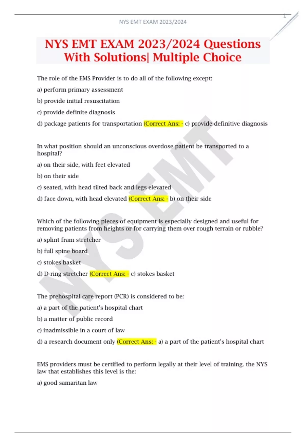 NYS EMT EXAM #1 2023/2024 Questions With Solutions| Multiple Choice