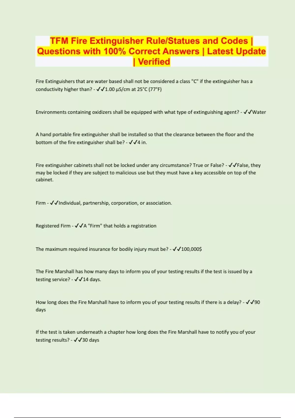 TFM Fire Extinguisher Rule/Statues and Codes | Questions with 100% Correct Answers | Latest Update | Verified Fire Extinguishers that are water based shall not be considered a class "C" if the extinguisher has a conductivity higher than? - 1.00 μS/cm at 25°C (77°F) Environments containing oxidizers shall be equipped with what type of extinguishing agent? - Water A hand portable fire extinguisher shall be installed so that the clearance between the floor and the bottom of the fire extinguisher shall be? - 4 in. Fire extinguisher cabinets shall not be locked under any circumstance? True or False? - False, they may be locked if they are subject to malicious use but they must have a key accessible on top of the cabinet. Firm - Individual, partnership, corporation, or association. Registered Firm - A "Firm" that holds a registration The maximum required insurance for bodily injury must be? - 100,000$ The Fire Marshall has how many days to inform you of your testing results if the test is issued by a testing service? - 14 days. How long does the Fire Marshall have to inform you of your testing results if there is a delay? - 90 days If the test is taken underneath a chapter how long does the Fire Marshall have to notify you of your testing results? - 30 days When does an apprentice permit expire? - On the anniversary of the date of issuance. How many days does the State Fire Marshall have to notify you of impending expiration of your license? - 30 days. A firm or individual whose license has been expired up to 90 days is required to pay. - The required renewal fee plus half of the initial fee of the registration or certificate. A firm or individual whose license has been expired for more than 90 days, but less than 2 years is required to pay what fees? - 1) all unpaid renewal fees 2) a fee that is equal to the initial fee of the registration or certificate. What does Section 6001.253 allow? - The commissioner to suspend, revoke, or refuse to issue or renew a certificate, license, permit, or approval.