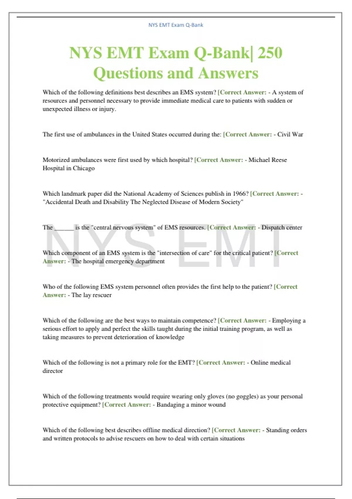 NYS EMT Exam Q-Bank| 250 Questions and Answers