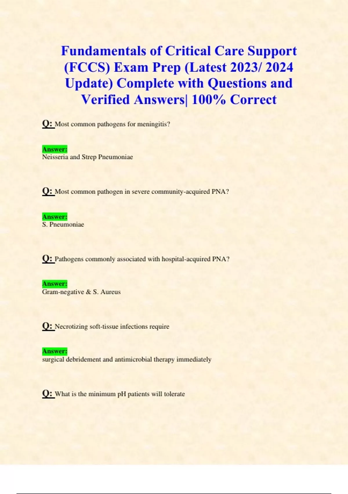Fundamentals of Critical Care Support (FCCS) Exam Prep (Latest 2023/ 2024 Update) Complete with Questions and Verified Answers| 100% Correct Q: Most common pathogens for meningitis? Answer: Neisseria and Strep Pneumoniae Q: Most common pathogen in severe community-acquired PNA? Answer: S. Pneumoniae Q: Pathogens commonly associated with hospital-acquired PNA? Answer: Gram-negative & S. Aureus Q: Necrotizing soft-tissue infections require Answer: surgical debridement and antimicrobial therapy immediately Q: What is the minimum pH patients will tolerate Answer: 7.20 Q: What is normal tidal volume Answer: 6-8ml/kg of IBW Q: What is normal minute ventilation? Answer: 7,000-8,000 Q: Normal inspiratory time in adult Answer: 1 sec, COPD -> up to 3 seconds Q: Normal expiration time Answer: 2 seconds Q: Minute ventilation equation Answer: MV = RR x TV Q: Where should the ETT terminate on the chest XR? Answer: 2-6cm above the carina (below the clavicle, above the heart) Q: What is the optimal peak inspiratory pressure on the ventilator? Answer: < 35mmHg Q: What is the optimal plateau pressure on the ventilator? Answer: < 30 mmHg Q: What is the best indicator of alveolar trauma? Answer: Plateau pressure Q: What are the consequences of Auto-PEEP Answer: Increased inspiratory pressure, hypotension, worsened oxygenation Q: What interventions can you attempt to avoid auto-PEEPing? Answer: