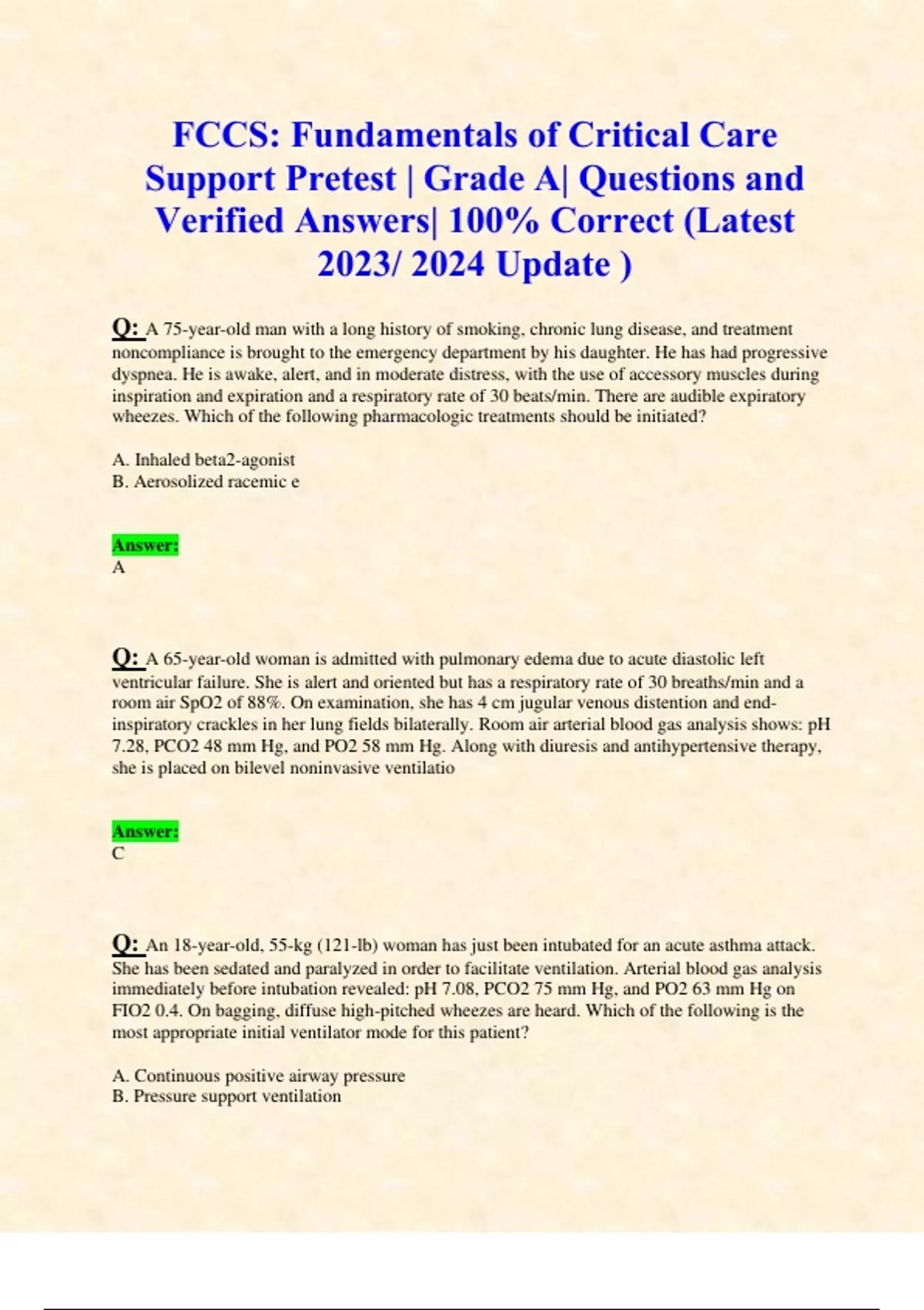 FCCS: Fundamentals of Critical Care Support Pretest | Grade A| Questions and Verified Answers| 100% Correct (Latest 2023/ 2024 Update ) Q: A 75-year-old man with a long history of smoking, chronic lung disease, and treatment noncompliance is brought to the emergency department by his daughter. He has had progressive dyspnea. He is awake, alert, and in moderate distress, with the use of accessory muscles during inspiration and expiration and a respiratory rate of 30 beats/min. There are audible expiratory wheezes. Which of the following pharmacologic treatments should be initiated? A. Inhaled beta2-agonist B. Aerosolized racemic e Answer: A Q: A 65-year-old woman is admitted with pulmonary edema due to acute diastolic left ventricular failure. She is alert and oriented but has a respiratory rate of 30 breaths/min and a room air SpO2 of 88%. On examination, she has 4 cm jugular venous distention and end-inspiratory crackles in her lung fields bilaterally. Room air arterial blood gas analysis shows: pH 7.28, PCO2 48 mm Hg, and PO2 58 mm Hg. Along with diuresis and antihypertensive therapy, she is placed on bilevel noninvasive ventilatio Answer: C Q: An 18-year-old, 55-kg (121-lb) woman has just been intubated for an acute asthma attack. She has been sedated and paralyzed in order to facilitate ventilation. Arterial blood gas analysis immediately before intubation revealed: pH 7.08, PCO2 75 mm Hg, and PO2 63 mm Hg on FIO2 0.4. On bagging, diffuse high-pitched wheezes are heard. Which of the following is the most appropriate initial ventilator mode for this patient? A. Continuous positive airway pressure B. Pressure support ventilation C. Answer: C Q: A 56-year-old man presents to the emergency department with a three-day history of fever, shaking chills, cough, and sputum production. He was previously in good health and takes only amlodipine for a history of hypertension. In the emergency department, his heart rate is 130 beats/min, respiratory rate 32breaths/min, blood pressure 80/40 mm Hg, temperature 38.8°C (102°F), and oxygen saturation 92% on 6 liters of oxygen by nasal cannula. Pulmonary examination demonstrates crackles and bronchia Answer: B Q: A 56-year-old man is admitted to the ICU for pneumonia. He is intubated, with the following settings: assist control, tidal volume 550 mL, respiratory rate 12 breaths/min, positive end-expiratory pressure 5 cm H2O, FIO2 1.0. Vital signs are: temperature 38.7°C (101.6°F), heart rate 122 beats/min, respiratory rate 20 breaths/min, blood pressure (BP) 88/46 mmHg, SpO2 97%. A central venous line and arterial line have been placed. He has been started on broad-spectrum antibiotics. Which of the fol Answer: B Q: A 75-year-old man with a history of hypertension is evaluated in the emergency department for nausea, vomiting, and abdominal pain. He is lethargic but can answer questions appropriately. His pulse is 130 beats/min, blood pressure 70/30 mm Hg, and respiratory rate 28 breaths/min. On physical examination, he is noted to have dry mucous membranes, poor capillary refill, and a distended abdomen with rebound tenderness. Arterial blood gas analysis reveals: pH 7.32, PCO2 28 mmHg, PO2 74 mm Hg, bicarb Answer: C Q: A 65-year-old man is septic, with perforated diverticulitis. He undergoes emergent colectomy with creation of a colostomy. Multiple areas of purulence are identified in the peritoneal cavity. Postoperatively, he continues to be febrile and hypotensive. Chest radiograph is clear. Central venous pressure is 18 mm Hg, and hemoglobin is 13g/dL. Which of the following vasoactive drugs is most appropriate to administer next? A. Epinephrine B. Phenylephrine C. Norepinephrine D. Dobutamine Answer: C Q: A 76-year-old woman with a history of congestive heart failure and hypertension is admitted with altered mental status and mild upper respiratory symptoms. According to family, her mental status has been gradually declining over the past three to four days. Because of generalized weakness and upper respiratory symptoms, she has had a limited amount of food and drink for the past 72 hours. Her home medications include metoprolol, lisinopril, and furosemide. Her family states that she has been com Answer: B Q: While fighting a house fire, a 38-year-old man fell 10 feet through a burning roof into an actively burning bedroom. On arrival at the emergency department two hours later, he has abdominal pain. His focused assessment with sonography in trauma (FAST) examination shows fluid between his spleen and left kidney. His voice is hoarse, and he has carbonaceous sputum. He has blistering burns on his face and insensate burns over his anterior chest, abdomen, and his entire left upper extremity circumfer Answer: A