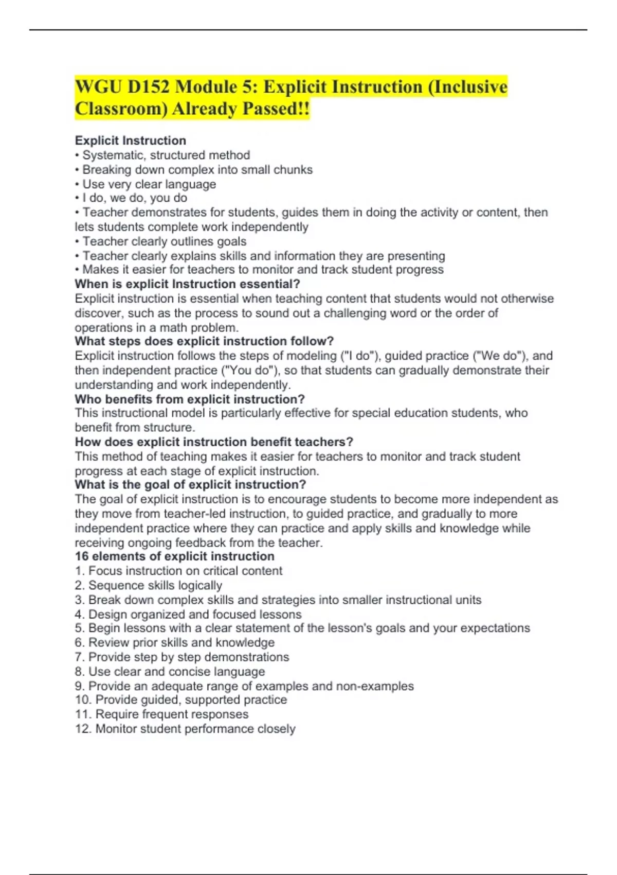 WGU D152 Module 5: Explicit Instruction (Inclusive Classroom) Already Passed!! Explicit Instruction • Systematic, structured method • Breaking down complex into small chunks • Use very clear language • I do, we do, you do • Teacher demonstrates for students, guides them in doing the activity or content, then lets students complete work independently • Teacher clearly outlines goals • Teacher clearly explains skills and information they are presenting • Makes it easier for teachers to monitor and track student progress When is explicit Instruction essential? Explicit instruction is essential when teaching content that students would not otherwise discover, such as the process to sound out a challenging word or the order of operations in a math problem. What steps does explicit instruction follow? Explicit instruction follows the steps of modeling ("I do"), guided practice ("We do"), and then independent
