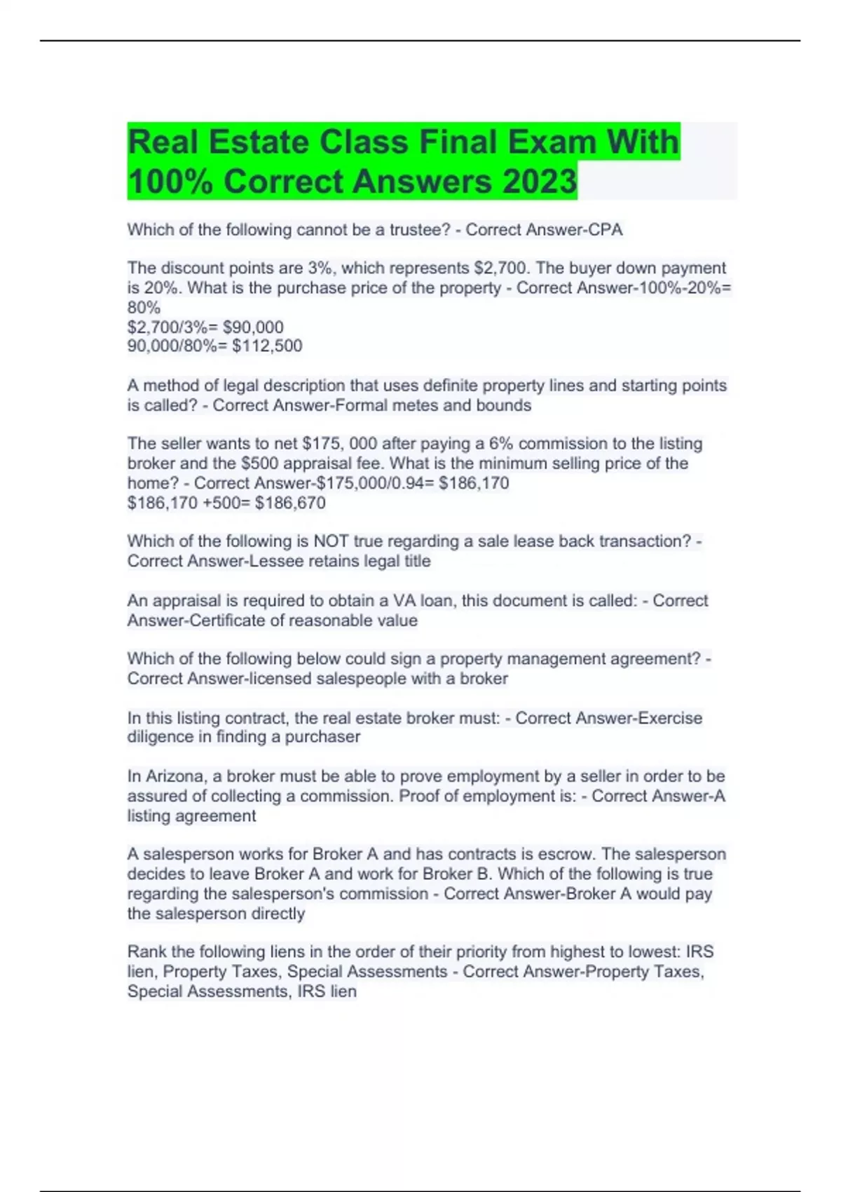 Real Estate Class Final Exam With 100% Correct Answers 2023